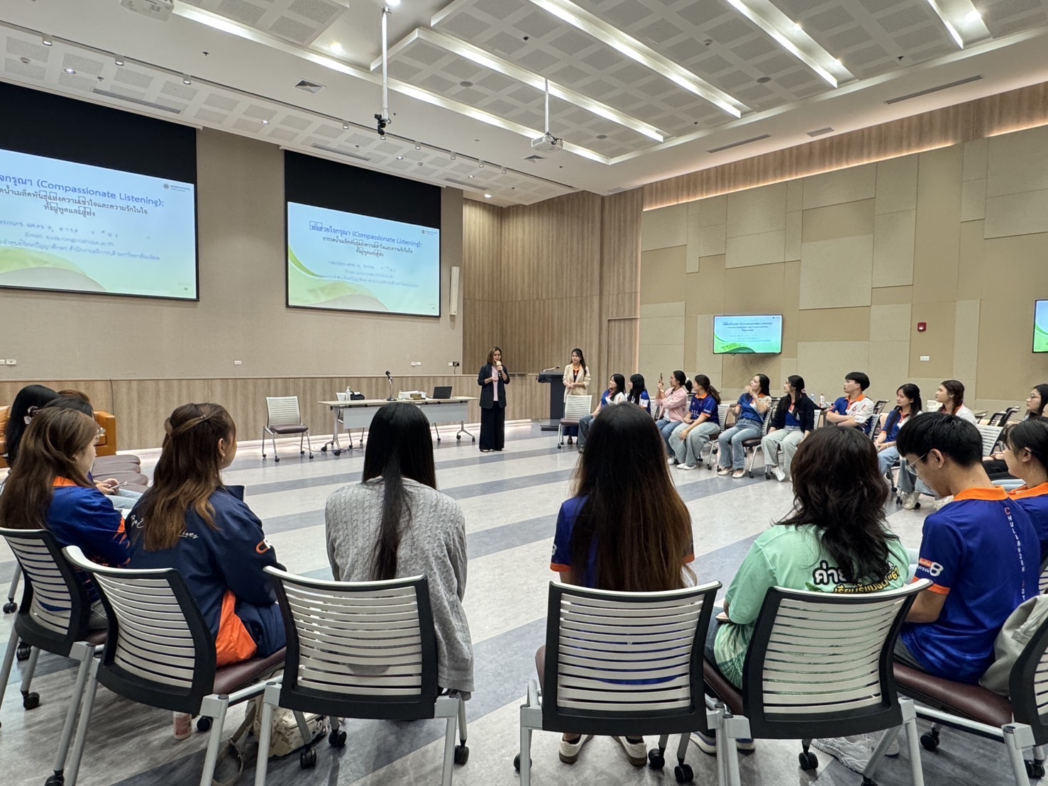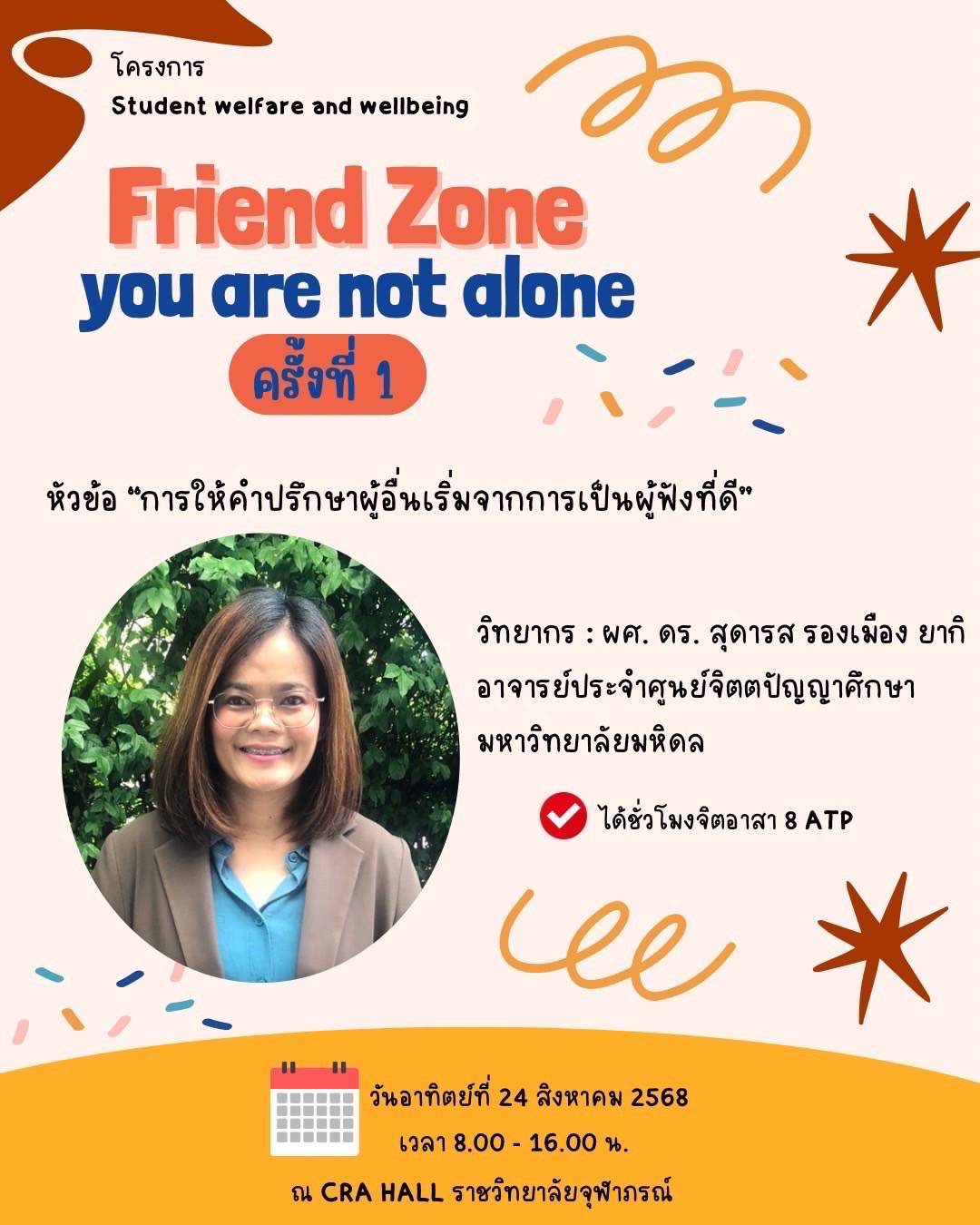 ✅ เมื่อวันที่ 24 สิงหาคม 2568 สโมสรนักศึกษาคณะพยาบาลศาสตร์อัครราชกุมารี จัดกิจกรรม Friend Zone : You are not alone หัวข้อ “พัฒนาทักษะการให้คำปรึกษาผู้อื่นด้วยการเริ่มต้นจากการเป็นผู้ฟังที่ดี” โดยได้เชิญวิทยากร คือ ผู้ช่วยศาสตราจารย์ ดร.สุดารส รองเมือง ยากิ อาจารย์ประจำศูนย์จิตตปัญญาศึกษา มหาวิทยาลัยมหิดล เป็นผู้ถ่ายทอดความรู้และฝึกทักษะให้กับนักศึกษา