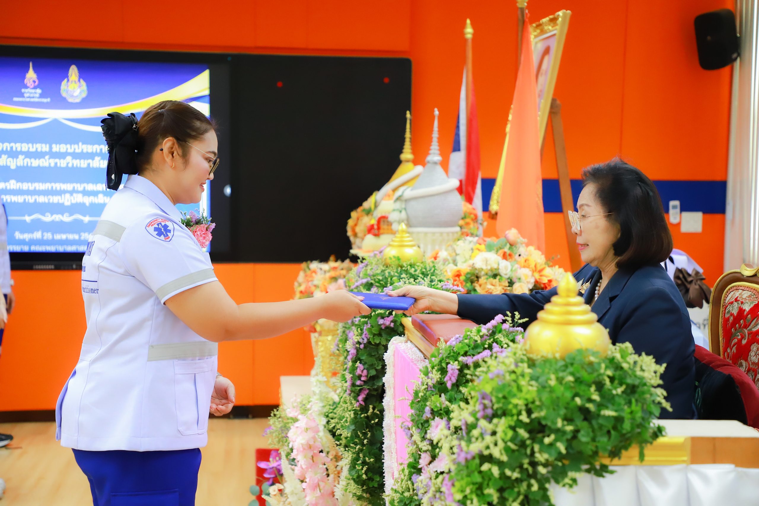 เมื่อวันที่ 25 เมษายน 2568 รองศาสตราจารย์ ดร.ทัศนา บุญทอง รักษาการคณบดีคณะพยาบาลศาสตร์อัครราชกุมารี ราชวิทยาลัยจุฬาภรณ์ ได้ให้เกียรติเป็นประธานในพิธีสำเร็จการอบรม มอบประกาศนียบัตร และเข็มสัญลักษณ์ราชวิทยาลัยจุฬาภรณ์ “หลักสูตรฝึกอบรมการพยาบาลเฉพาะทางสาขาการพยาบาลเวชปฏิบัติฉุกเฉิน” รุ่นที่ 1 พร้อมกล่าวแสดงความยินดีและให้โอวาทแก่ผู้สำเร็จการฝึกอบรม การนี้ ผู้บริหารฝ่ายการพยาบาล และผู้แทนจากโรงพยาบาลภูมิพลอดุลยเดช โรงพยาบาลจุฬาภรณ์ โรงพยาบาลตำรวจ และโรงพยาบาลปทุมธานี ได้เข้าร่วมเป็นเกียรติและแสดงความยินดีกับผู้สำเร็จการฝึกอบรมทั้ง 45 คน