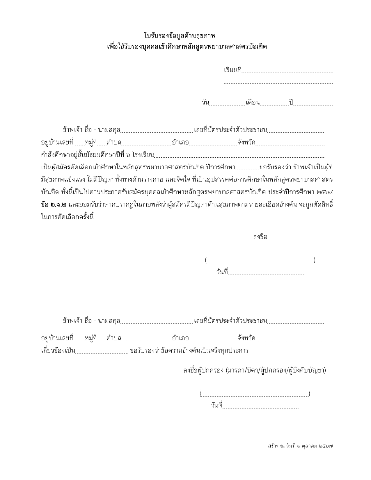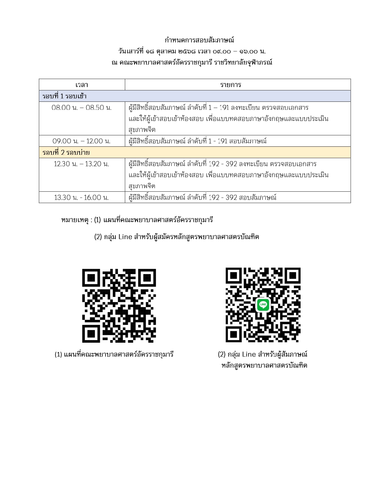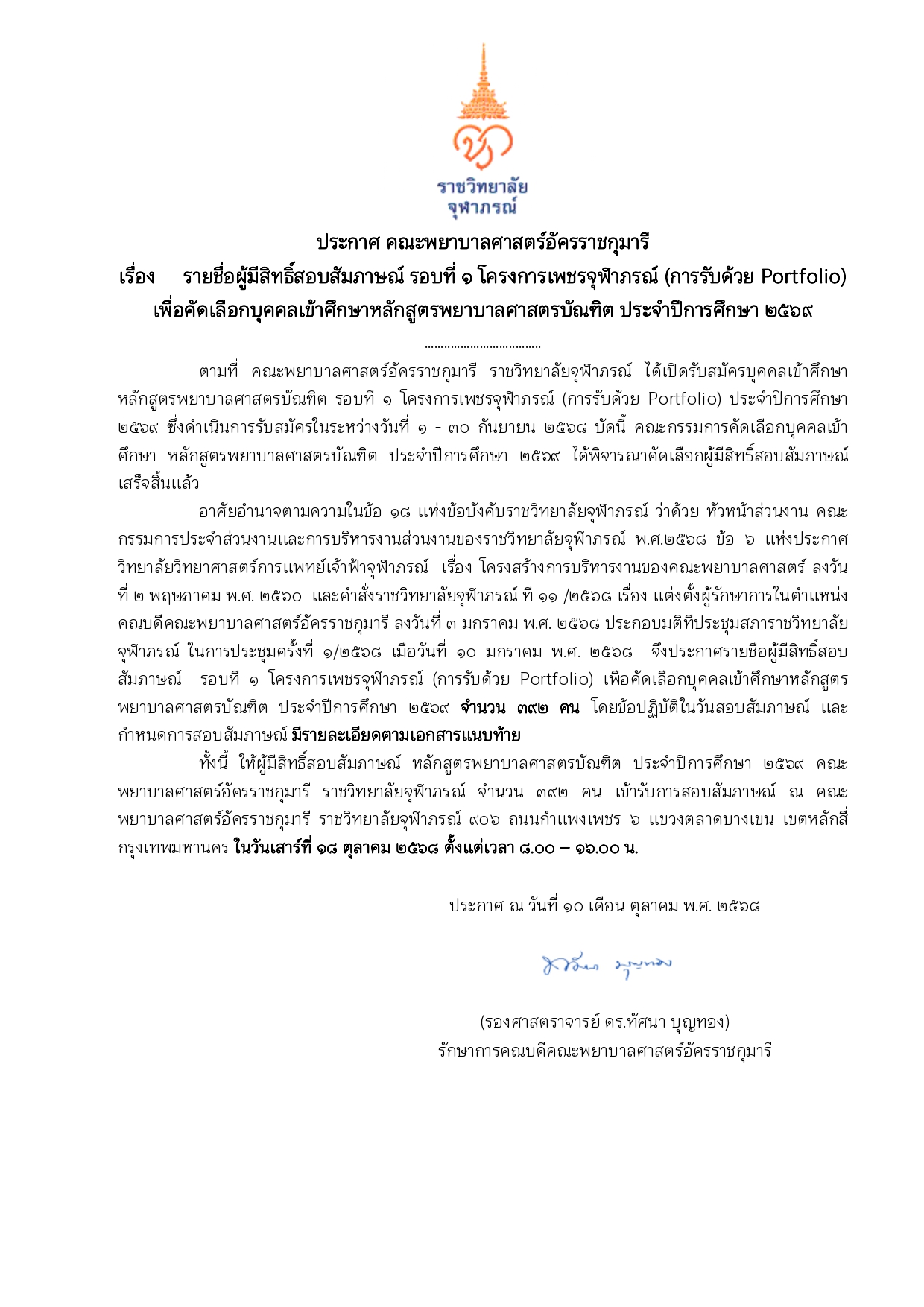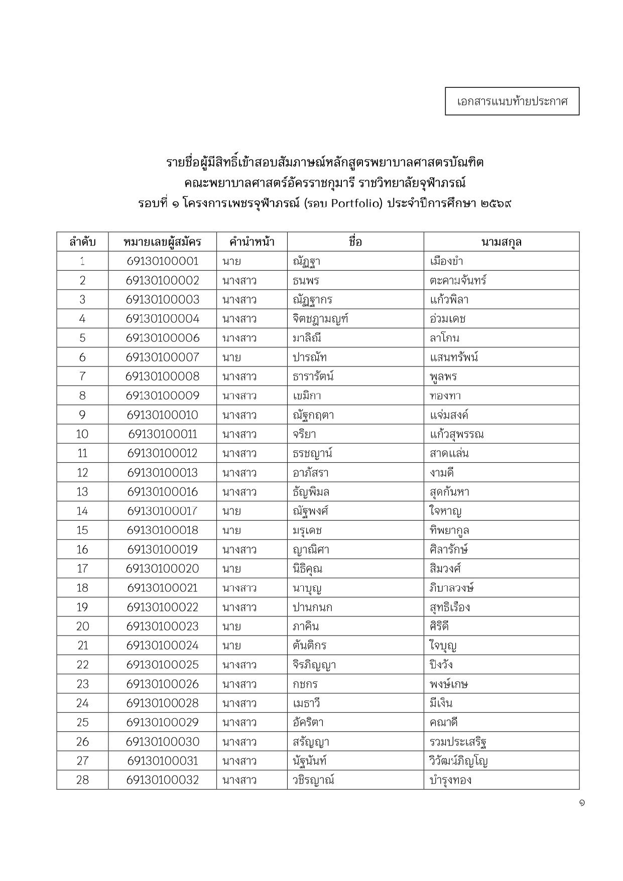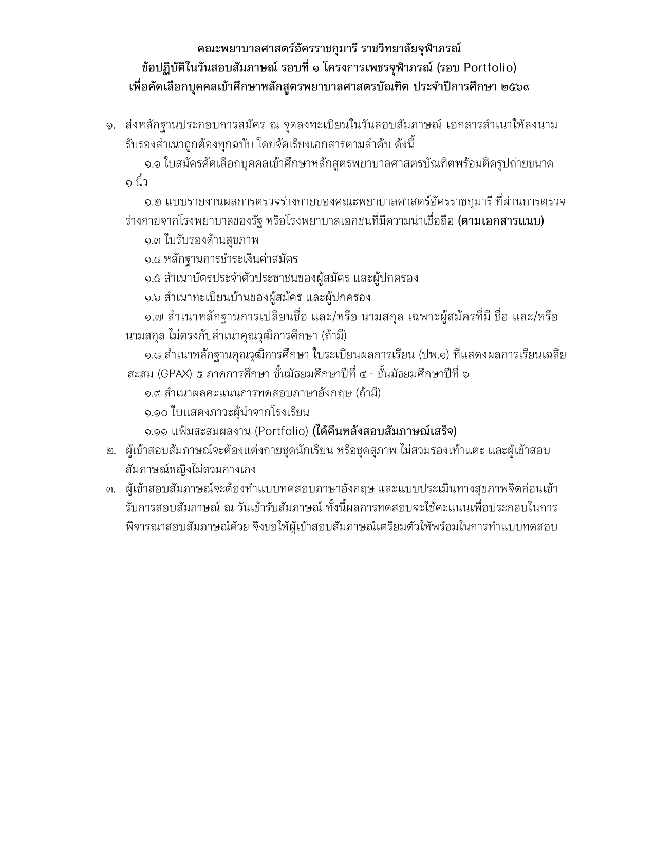 ประกาศ เรื่อง รายชื่อผู้มีสิทธิ์สอบสัมภาษณ์ รอบที่ ๑ โครงการเพชรจุฬาภรณ์ (การรับด้วย Portfolio) เพื่อคัดเลือกบุคคลเข้าศึกษาหลักสูตรพยาบาลศาสตรบัณฑิต ประจำปีการศึกษา ๒๕๖๙