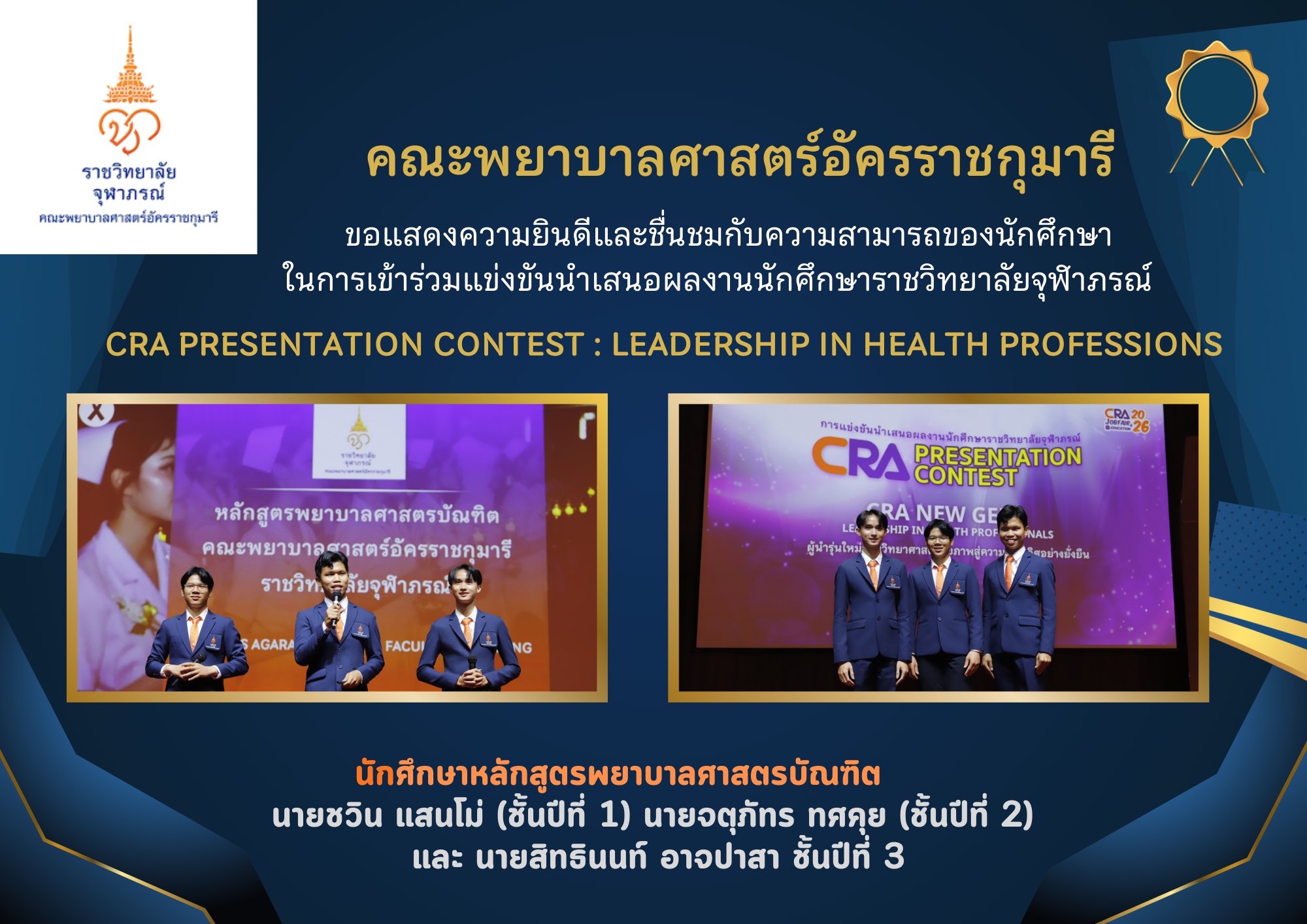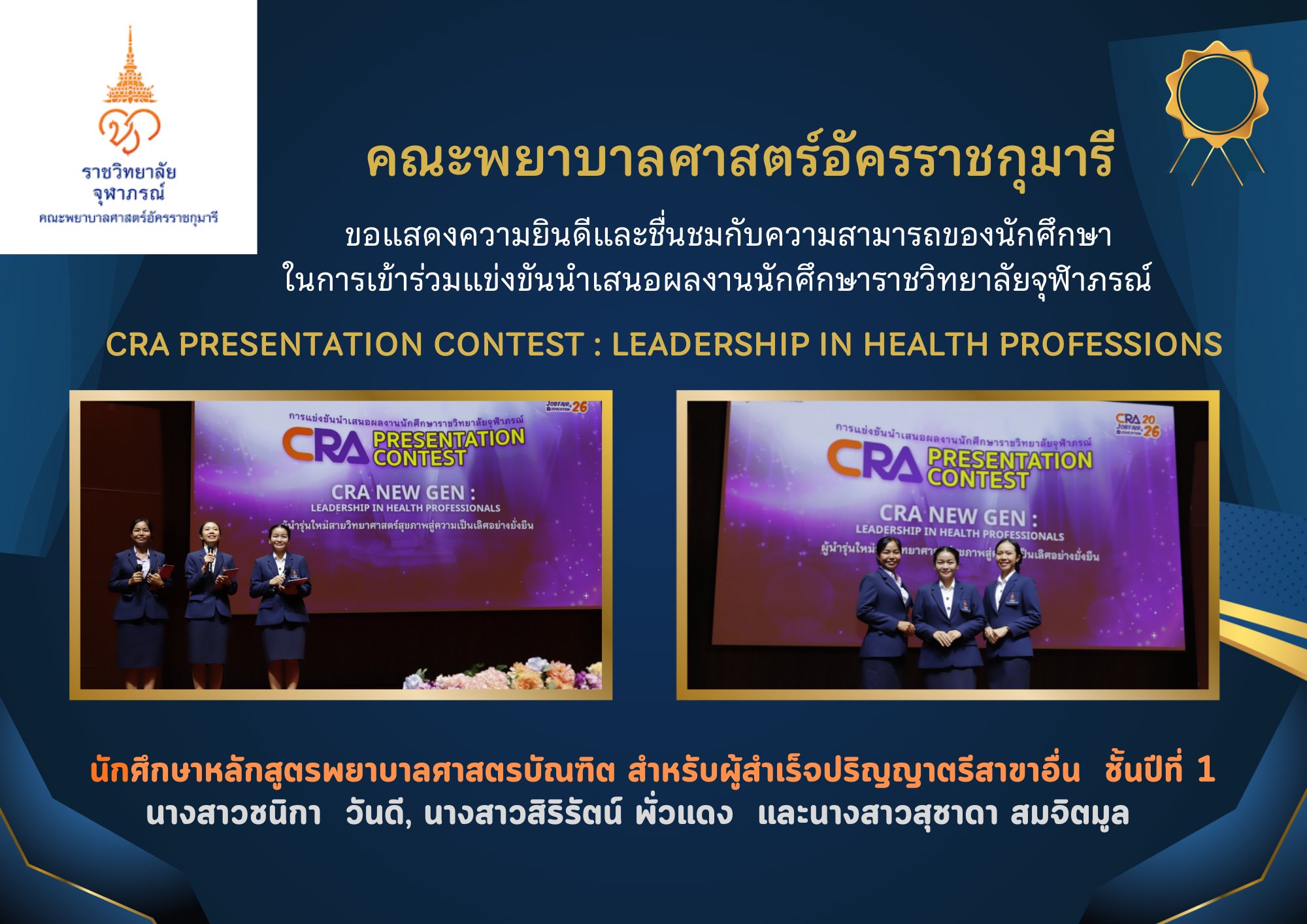 การเข้าร่วมแข่งขันนำเสนอผลงานนักศึกษาราชวิทยาลัยจุฬาภรณ์ กิจกรรม CRA Presentation Contest : Leadership in Health Professions และนำเสนอในงาน CRA Job Fair & Education 2026