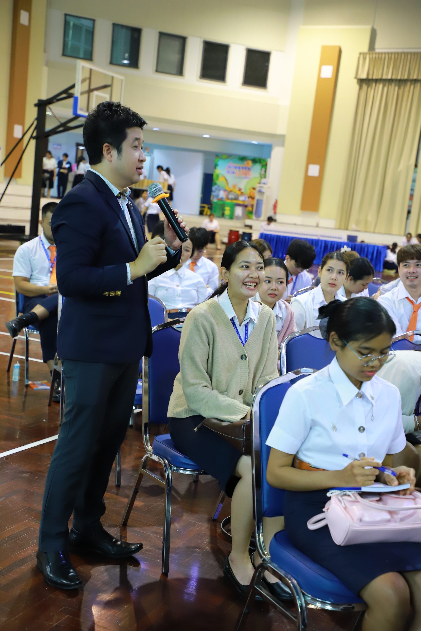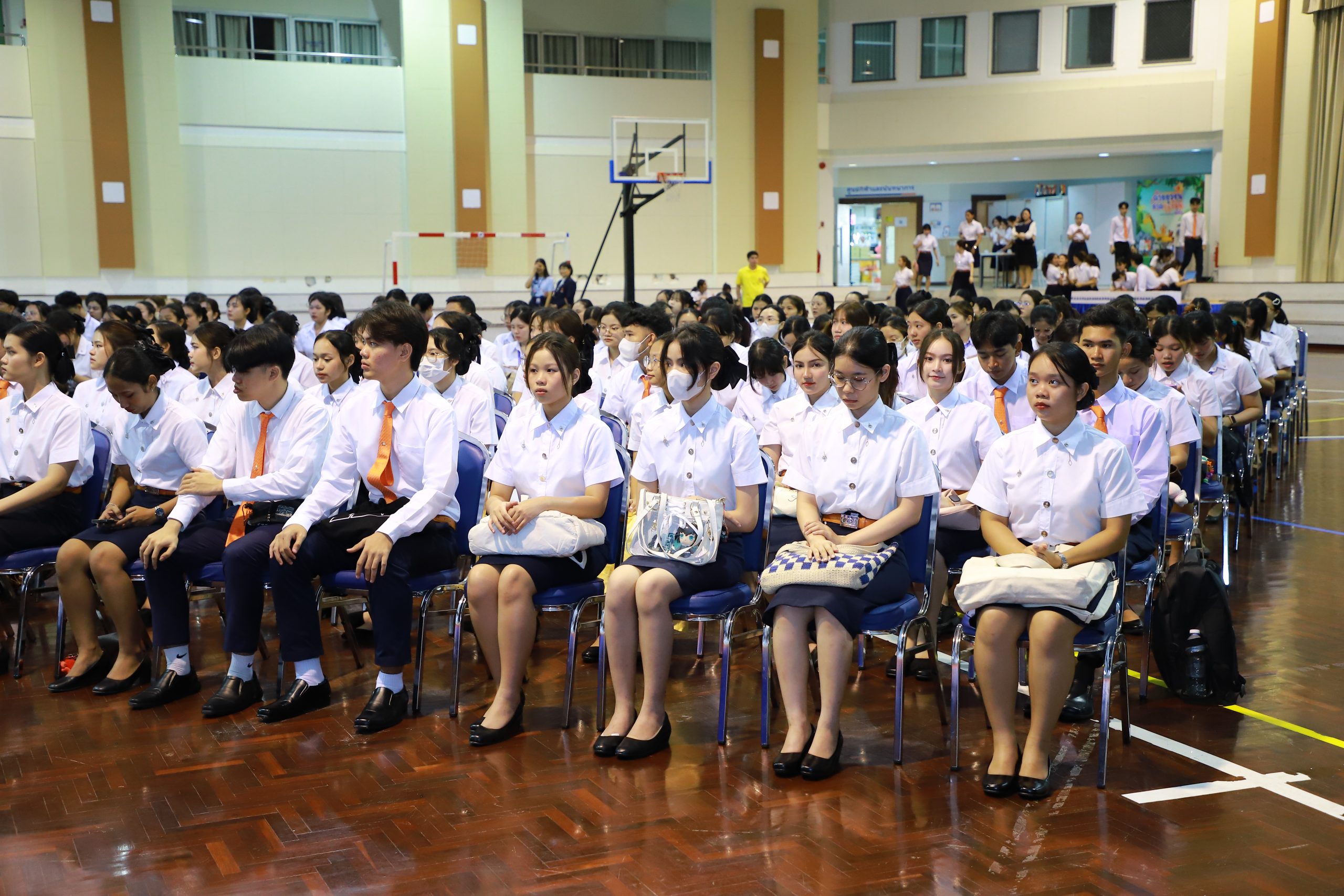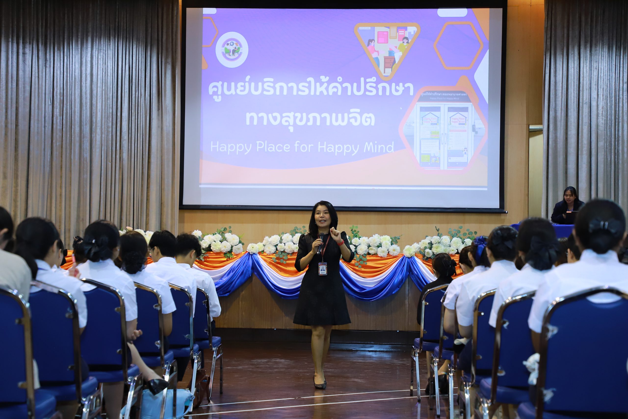 ต่อด้วยกิจกรรมเสริมสร้างสุขภาวะทางใจ โดย อาจารย์ ดร.ดวงแก้ว เตชะกาญจนเวช ผู้อำนวยการศูนย์บริการให้คำปรึกษา ได้นำนักศึกษาทำกิจกรรมเพื่อสำรวจภาวะสุขภาพใจของตนเอง แนะนำแหล่งความช่วยเหลือ เพื่อส่งเสริมให้นักศึกษามีสุขภาพจิตที่ดี และการแนะนำระบบบริการของห้องสมุด ระบบริการของฝ่ายทะเบียน และระบบสารสนเทศที่นักศึกษาต้องรู้ โดยเจ้าหน้าที่ฝ่ายสนับสนุนฯ
