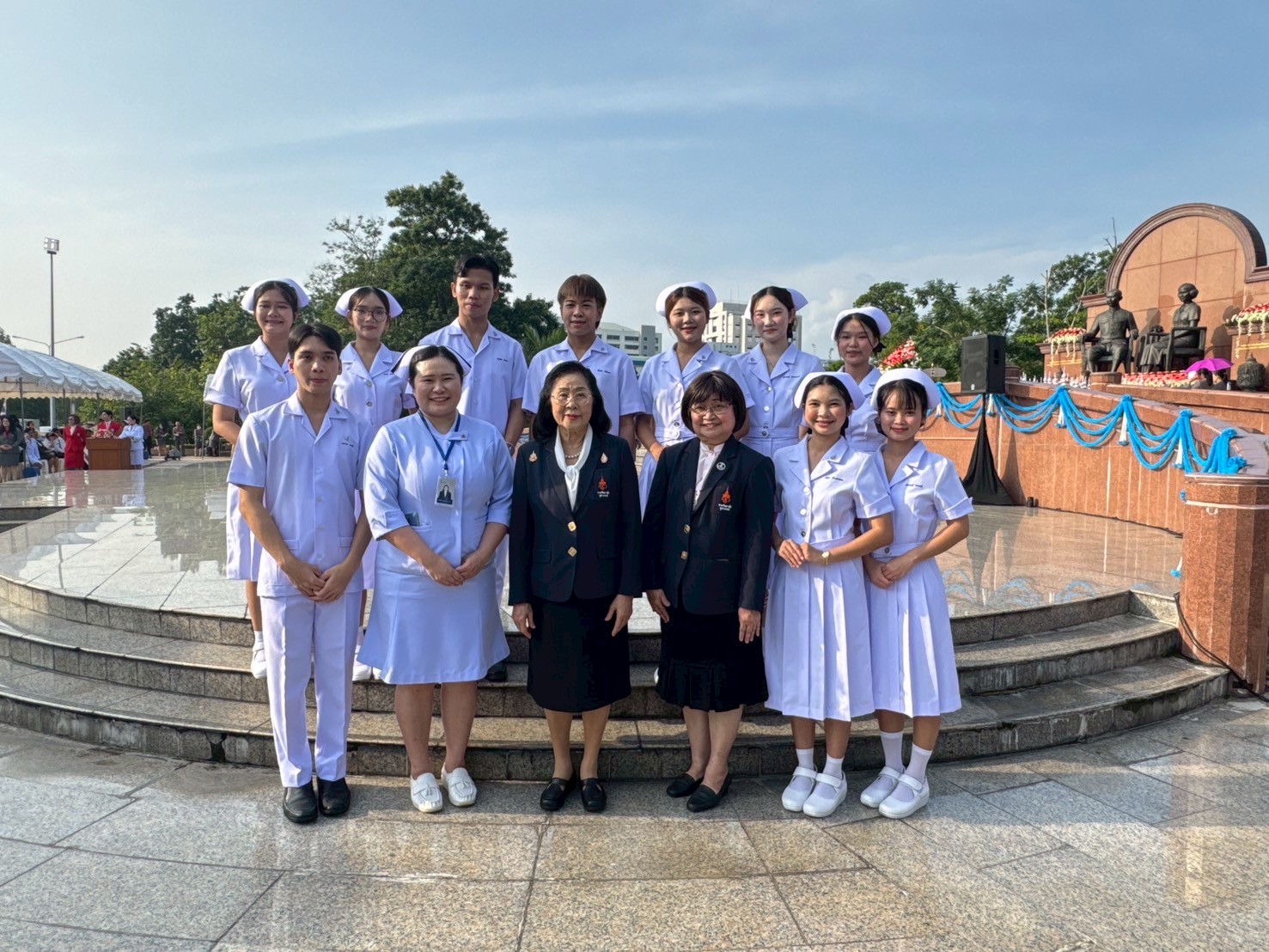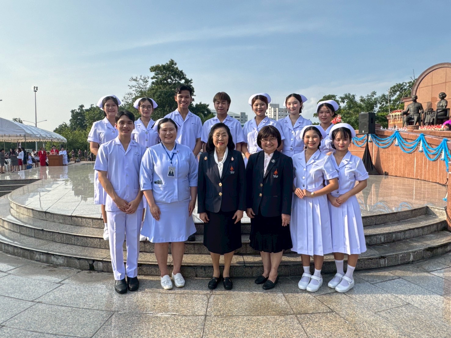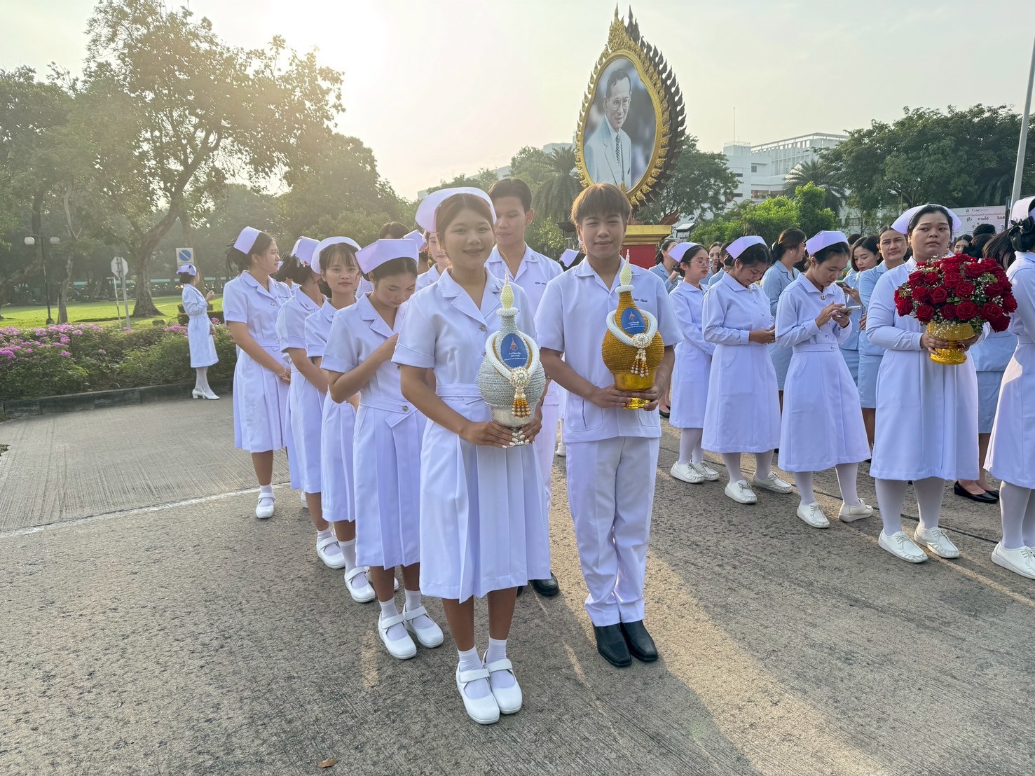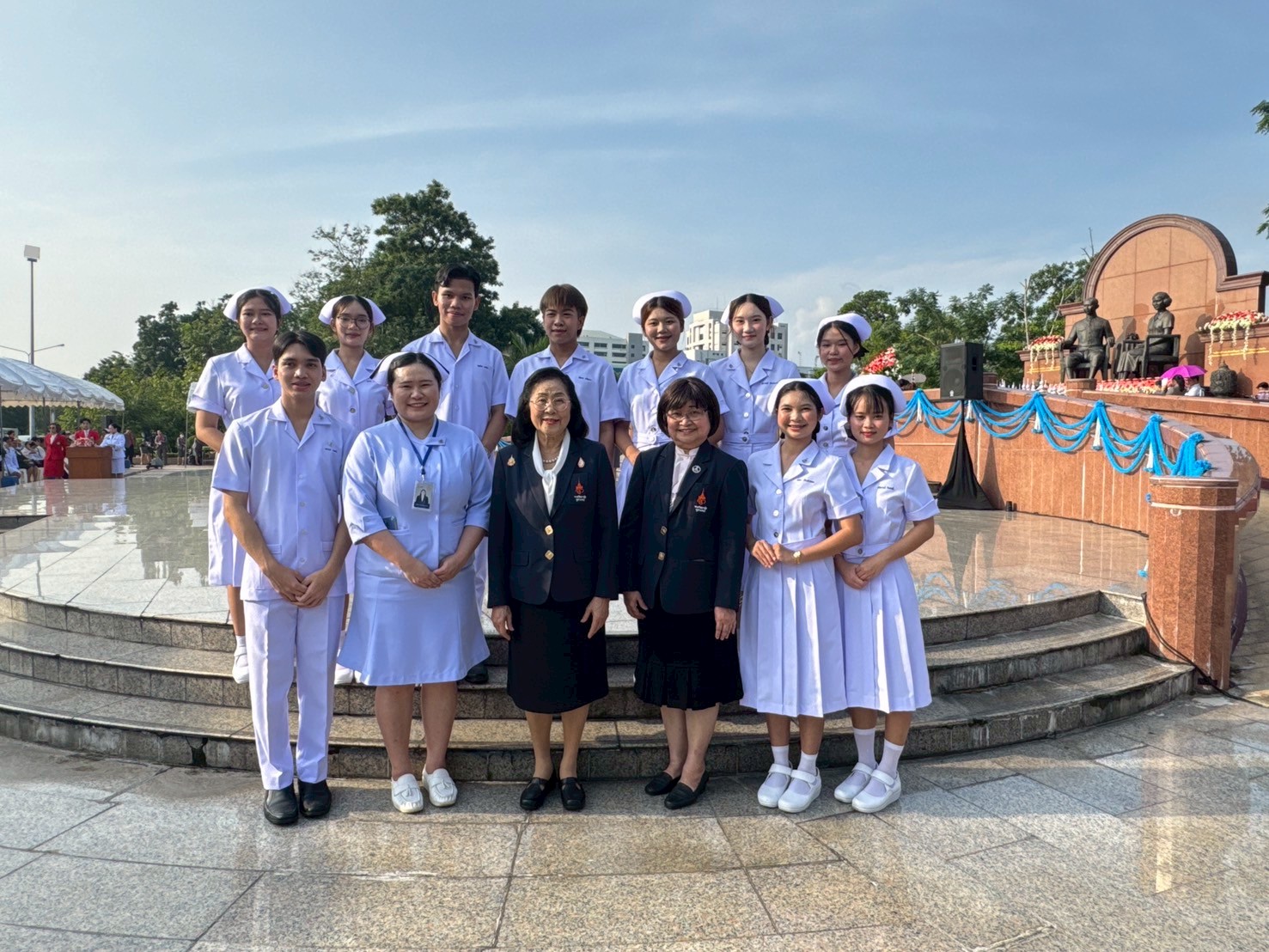 วันที่ 21 ตุลาคม 2568 คณะพยาบาลศาสตร์อัครราชกุมารี ราชวิทยาลัยจุฬาภรณ์ นำโดย รองศาสตราจารย์ ดร.ทัศนา บุญทอง คณบดีคณะพยาบาลศาสตร์อัครราชกุมารี พร้อมด้วยอาจารย์และนักศึกษา เข้าร่วมพิธีวางพานพุ่มถวายราชสักการะสมเด็จพระศรีนครินทราบรมราชชนนี เนื่องในวันพยาบาลแห่งชาติ ประจำปี 2568 ณ พระราชานุสาวรีย์สมเด็จพระมหิตลาธิเบศร อดุลยเดชวิกรม พระบรมราชชนก ประทับคู่สมเด็จพระศรีนครินทราบรมราชชนนี กระทรวงสาธารณสุข จังหวัดนนทบุรี