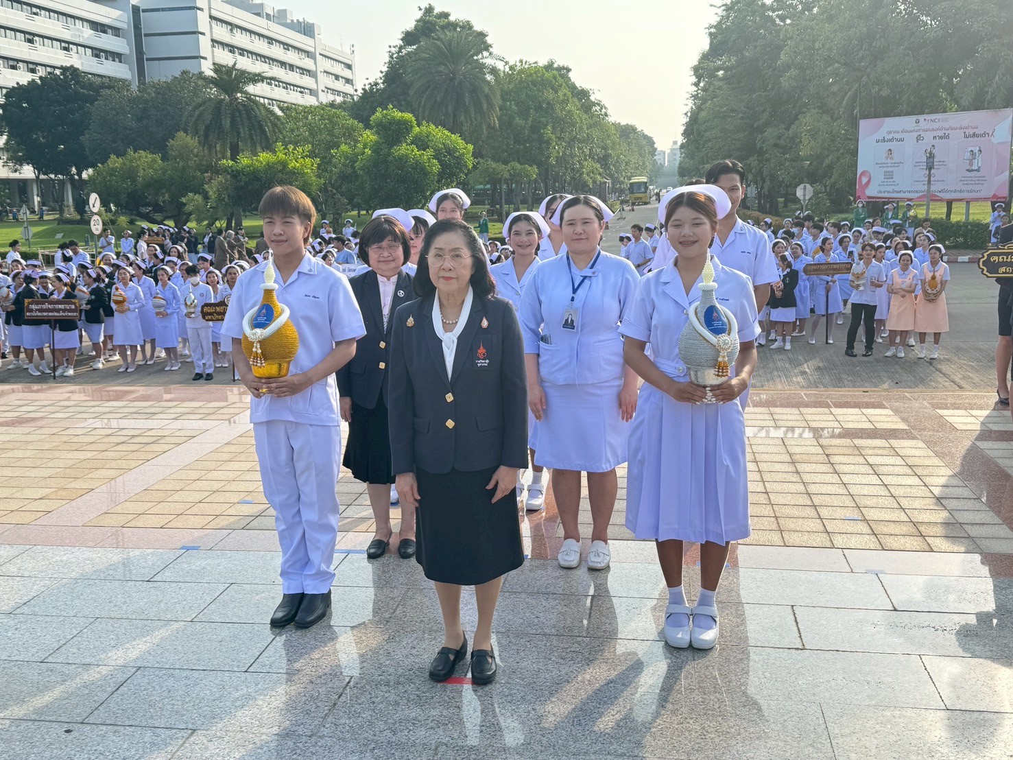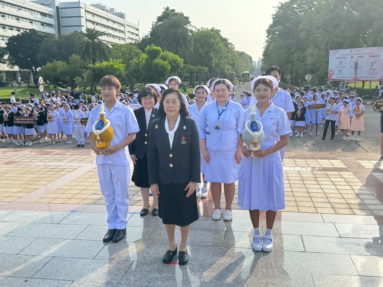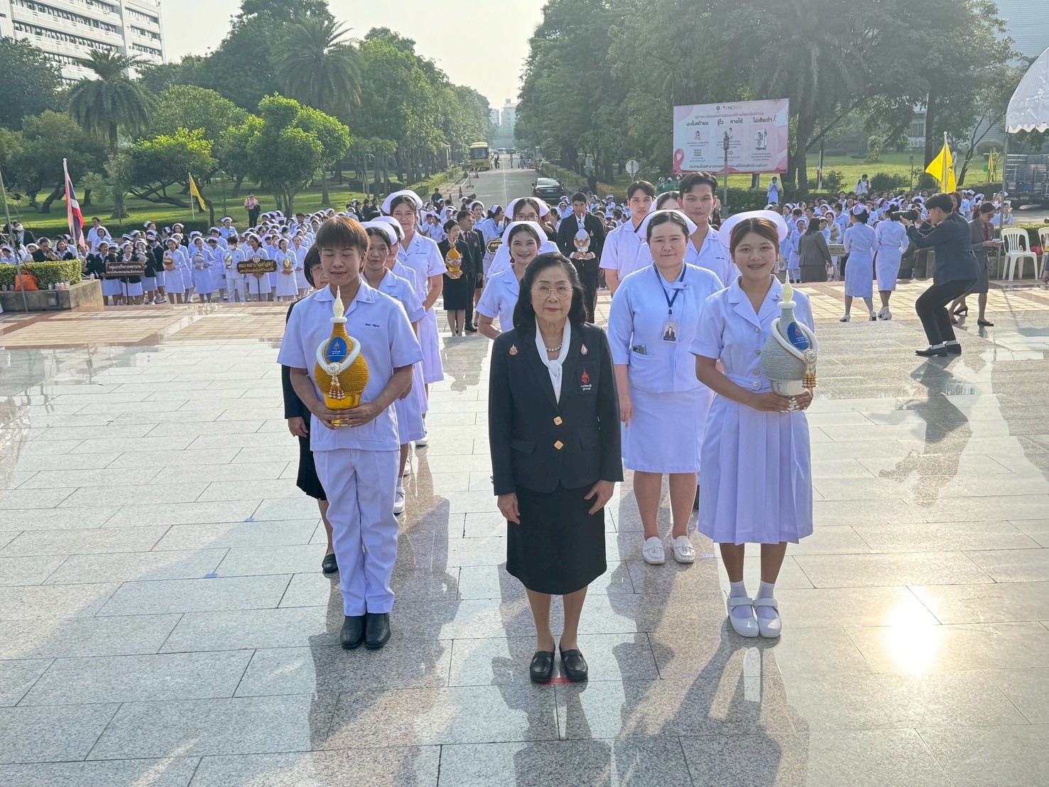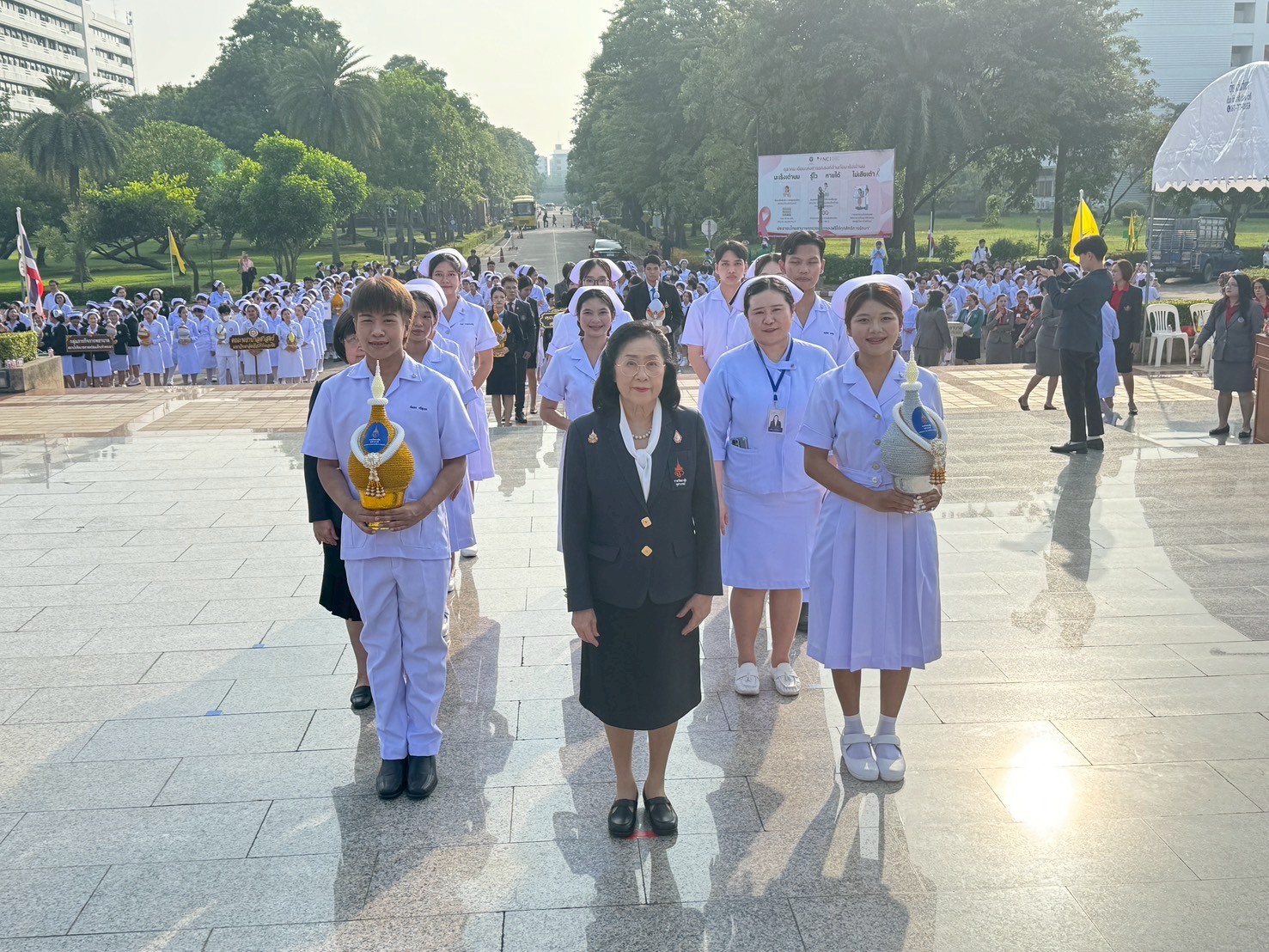 วันที่ 21 ตุลาคม 2568 คณะพยาบาลศาสตร์อัครราชกุมารี ราชวิทยาลัยจุฬาภรณ์ นำโดย รองศาสตราจารย์ ดร.ทัศนา บุญทอง คณบดีคณะพยาบาลศาสตร์อัครราชกุมารี พร้อมด้วยอาจารย์และนักศึกษา เข้าร่วมพิธีวางพานพุ่มถวายราชสักการะสมเด็จพระศรีนครินทราบรมราชชนนี เนื่องในวันพยาบาลแห่งชาติ ประจำปี 2568 ณ พระราชานุสาวรีย์สมเด็จพระมหิตลาธิเบศร อดุลยเดชวิกรม พระบรมราชชนก ประทับคู่สมเด็จพระศรีนครินทราบรมราชชนนี กระทรวงสาธารณสุข จังหวัดนนทบุรี