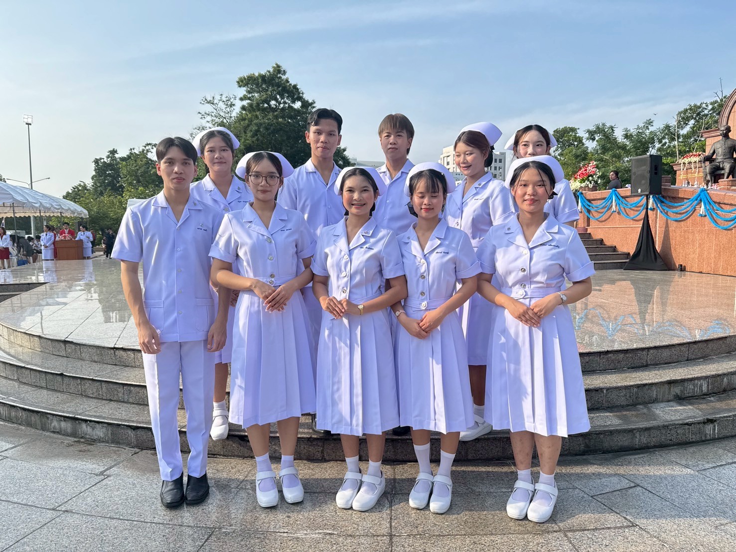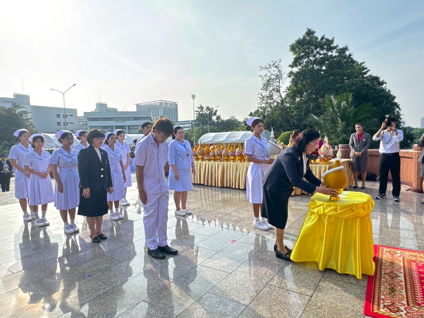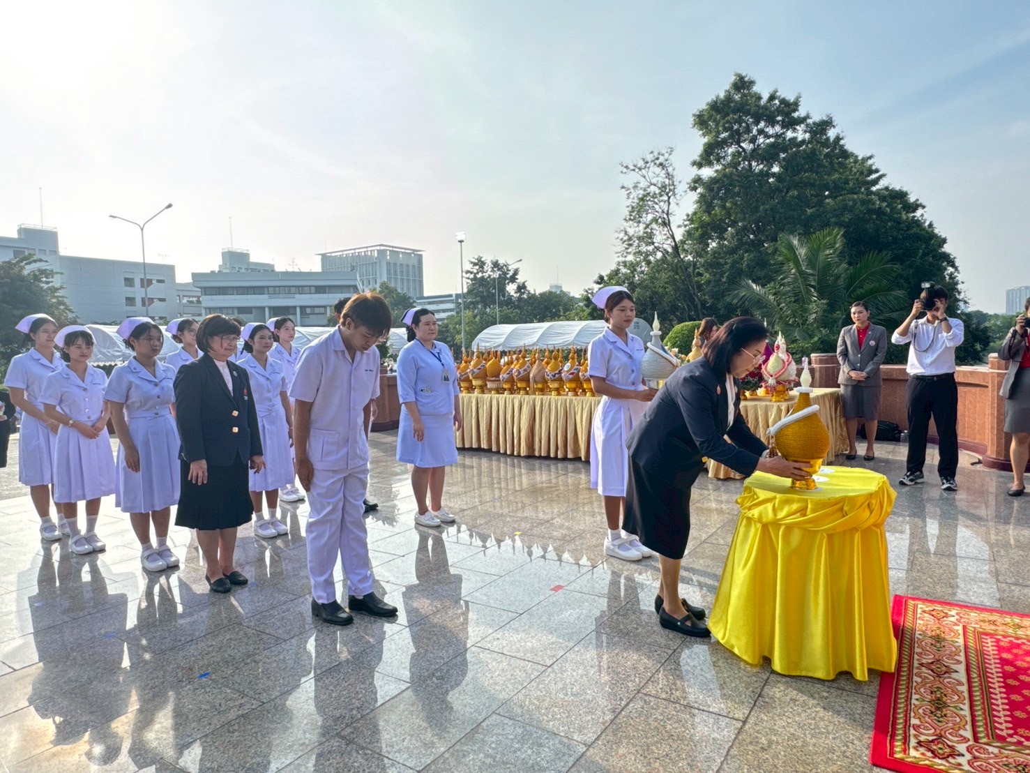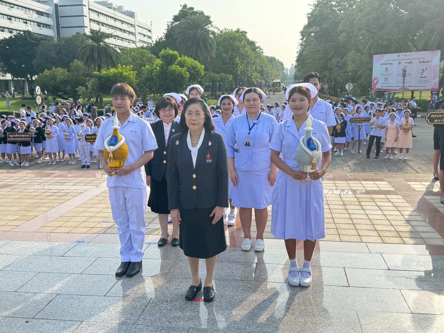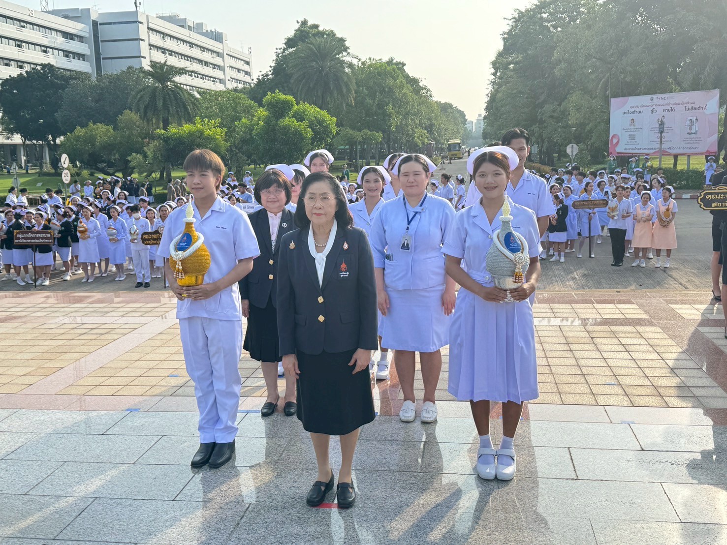 วันที่ 21 ตุลาคม 2568 คณะพยาบาลศาสตร์อัครราชกุมารี ราชวิทยาลัยจุฬาภรณ์ นำโดย รองศาสตราจารย์ ดร.ทัศนา บุญทอง คณบดีคณะพยาบาลศาสตร์อัครราชกุมารี พร้อมด้วยอาจารย์และนักศึกษา เข้าร่วมพิธีวางพานพุ่มถวายราชสักการะสมเด็จพระศรีนครินทราบรมราชชนนี เนื่องในวันพยาบาลแห่งชาติ ประจำปี 2568 ณ พระราชานุสาวรีย์สมเด็จพระมหิตลาธิเบศร อดุลยเดชวิกรม พระบรมราชชนก ประทับคู่สมเด็จพระศรีนครินทราบรมราชชนนี กระทรวงสาธารณสุข จังหวัดนนทบุรี