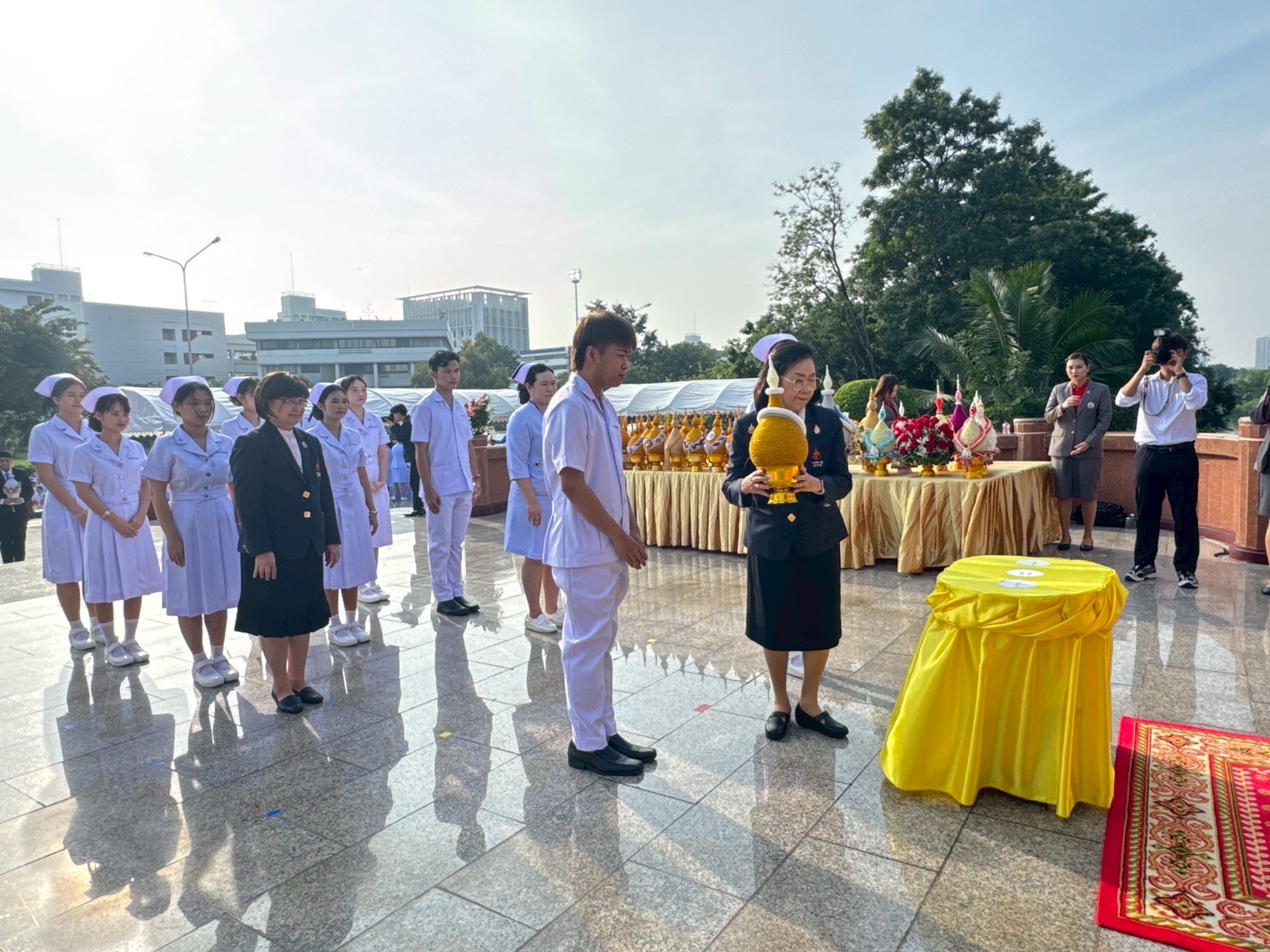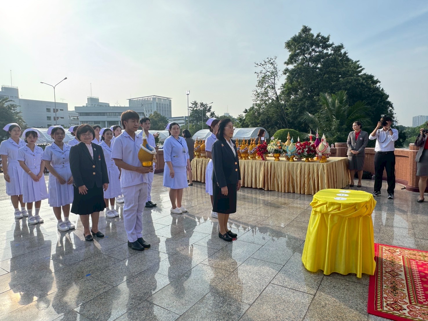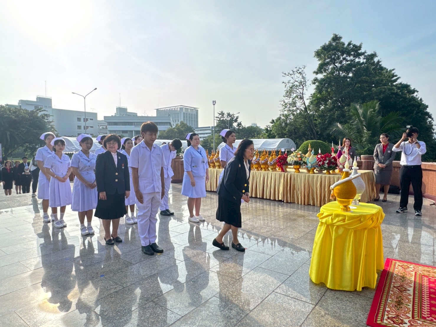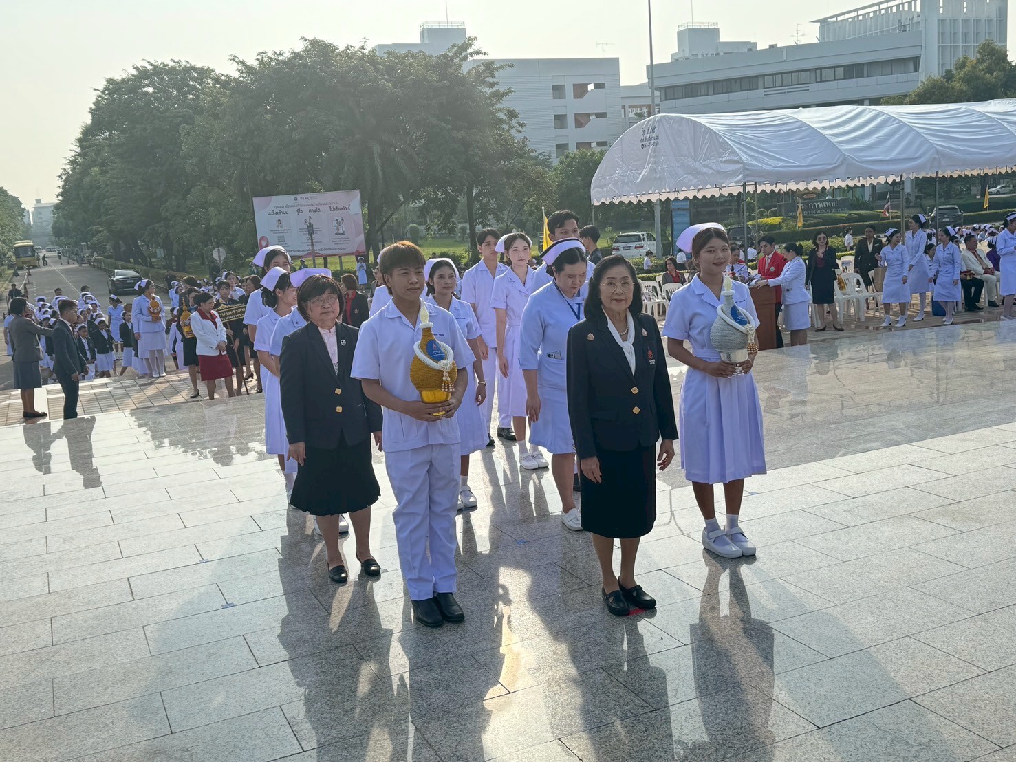 วันที่ 21 ตุลาคม 2568 คณะพยาบาลศาสตร์อัครราชกุมารี ราชวิทยาลัยจุฬาภรณ์ นำโดย รองศาสตราจารย์ ดร.ทัศนา บุญทอง คณบดีคณะพยาบาลศาสตร์อัครราชกุมารี พร้อมด้วยอาจารย์และนักศึกษา เข้าร่วมพิธีวางพานพุ่มถวายราชสักการะสมเด็จพระศรีนครินทราบรมราชชนนี เนื่องในวันพยาบาลแห่งชาติ ประจำปี 2568 ณ พระราชานุสาวรีย์สมเด็จพระมหิตลาธิเบศร อดุลยเดชวิกรม พระบรมราชชนก ประทับคู่สมเด็จพระศรีนครินทราบรมราชชนนี กระทรวงสาธารณสุข จังหวัดนนทบุรี