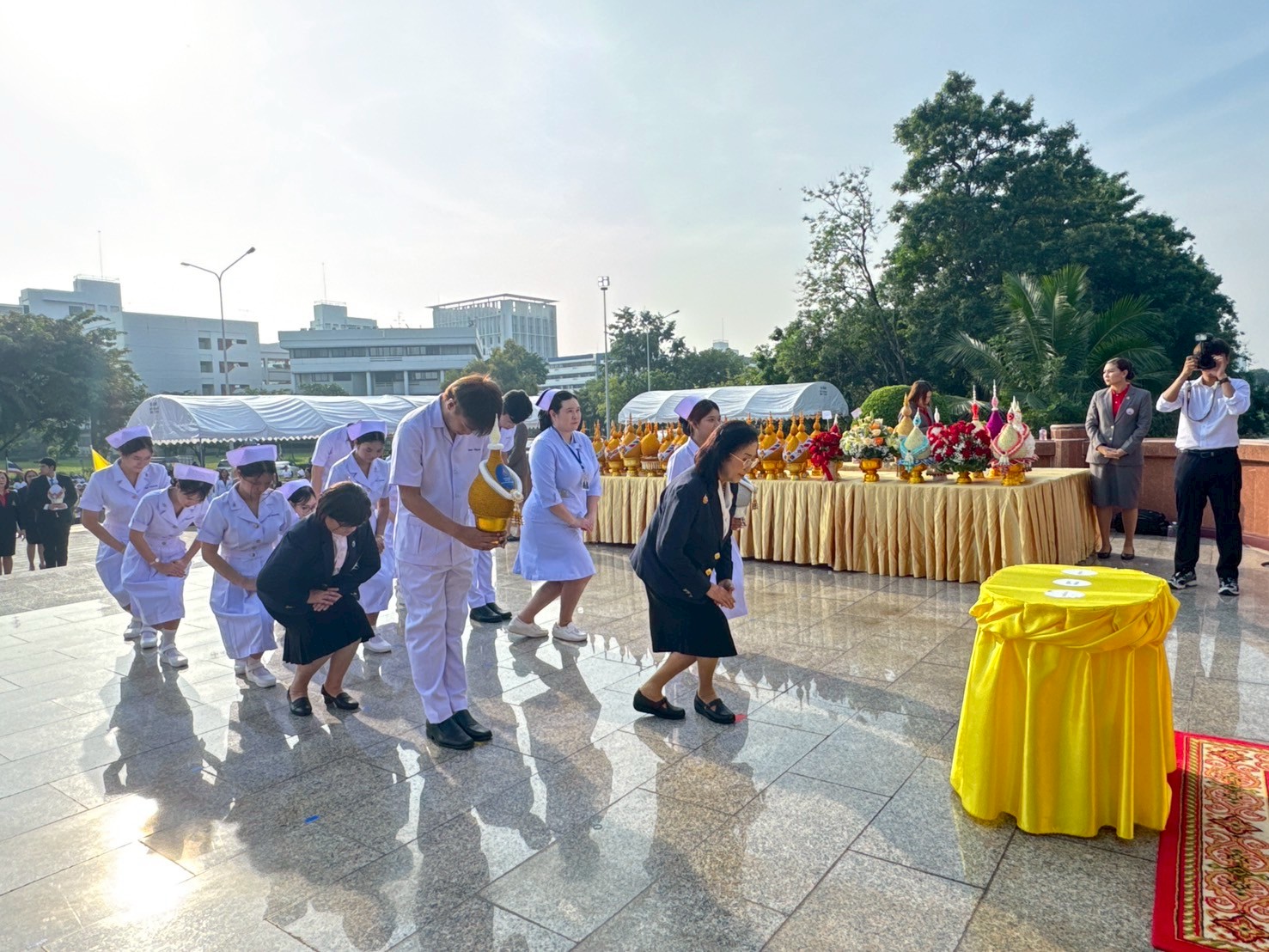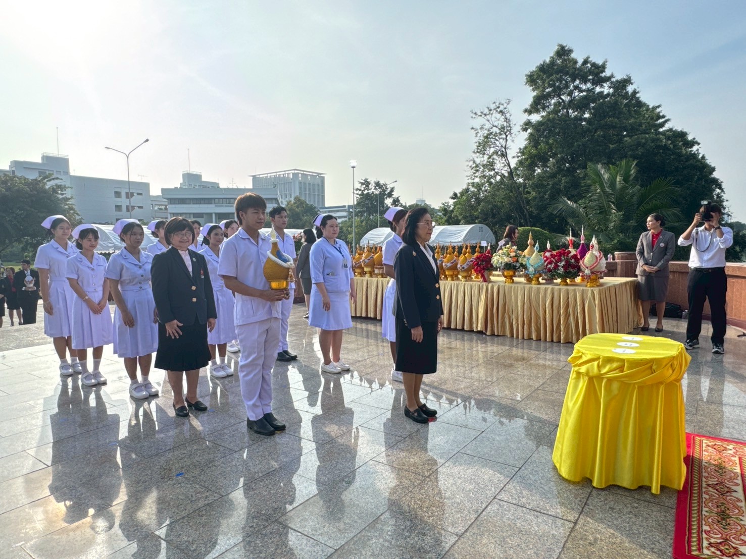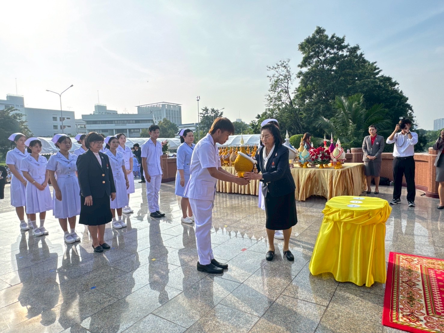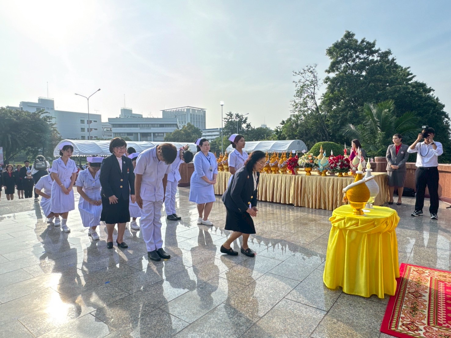 วันที่ 21 ตุลาคม 2568 คณะพยาบาลศาสตร์อัครราชกุมารี ราชวิทยาลัยจุฬาภรณ์ นำโดย รองศาสตราจารย์ ดร.ทัศนา บุญทอง คณบดีคณะพยาบาลศาสตร์อัครราชกุมารี พร้อมด้วยอาจารย์และนักศึกษา เข้าร่วมพิธีวางพานพุ่มถวายราชสักการะสมเด็จพระศรีนครินทราบรมราชชนนี เนื่องในวันพยาบาลแห่งชาติ ประจำปี 2568 ณ พระราชานุสาวรีย์สมเด็จพระมหิตลาธิเบศร อดุลยเดชวิกรม พระบรมราชชนก ประทับคู่สมเด็จพระศรีนครินทราบรมราชชนนี กระทรวงสาธารณสุข จังหวัดนนทบุรี