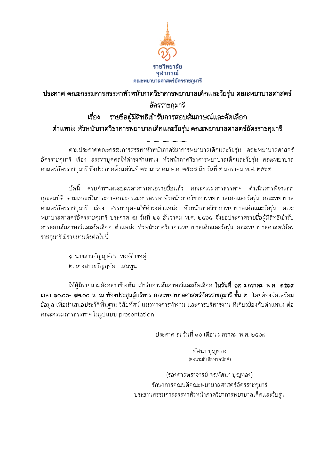ประกาศ คณะกรรมการสรรหาหัวหน้าภาควิชาการพยาบาลเด็กและวัยรุ่น คณะพยาบาลศาสตร์อัครราชกุมารี เรื่อง รายชื่อผู้มีสิทธิเข้ารับการสอบสัมภาษณ์และคัดเลือก ตำแหน่ง หัวหน้าภาควิชาการพยาบาลเด็กและวัยรุ่น คณะพยาบาลศาสตร์อัครราชกุมารี