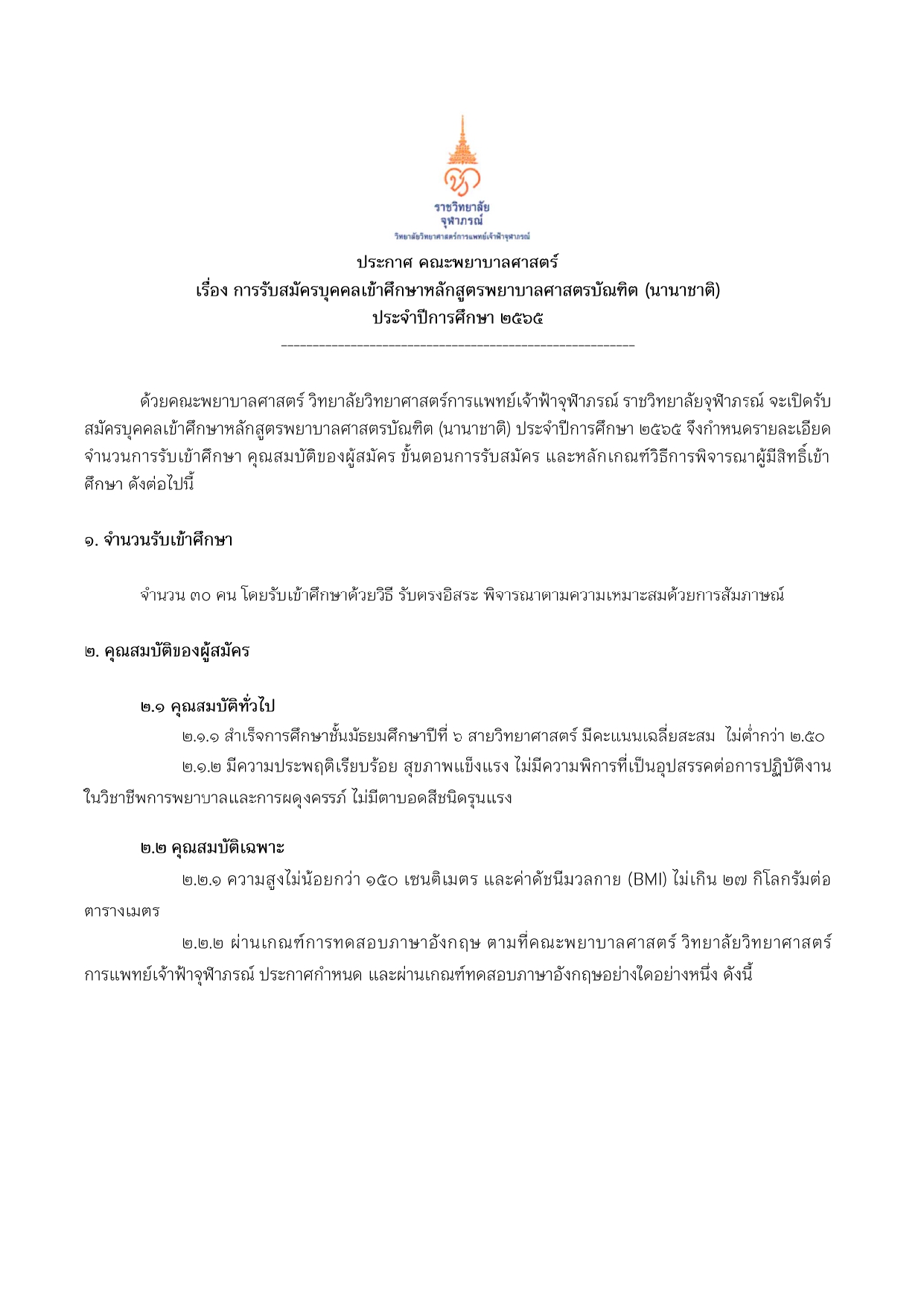 ประกาศ คณะพยาบาลศาสตร์ เรื่อง การรับสมัครบุคคลเข้าศึกษาหลักสูตรพยาบาลศาสตรบัณฑิต (นานาชาติ) ประจำปีการศึกษา ๒๕๖๕ Announcement by Faculty of Nursing Application for Admission to Bachelor of Nursing Science (International program) For 2020 Academic Year