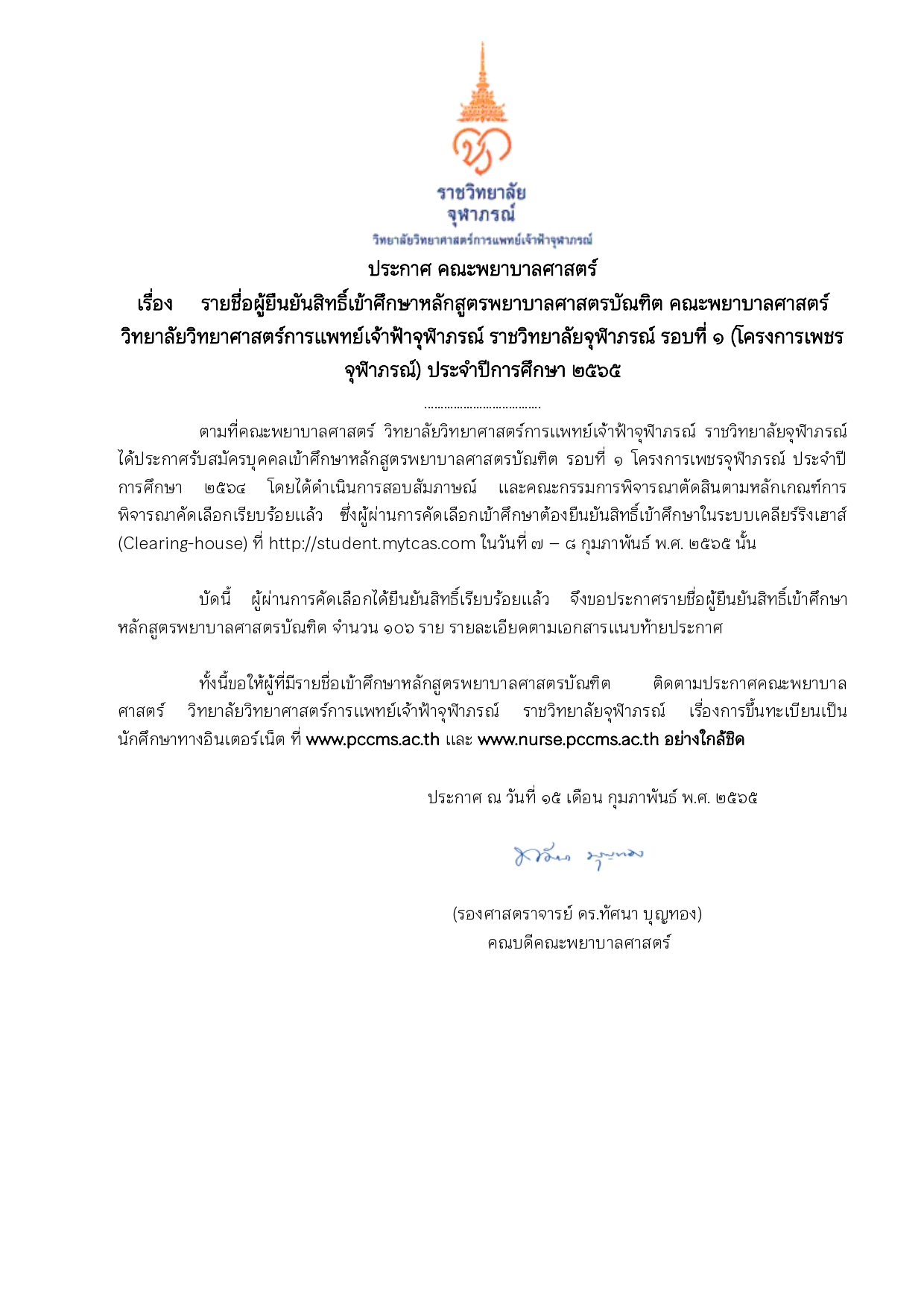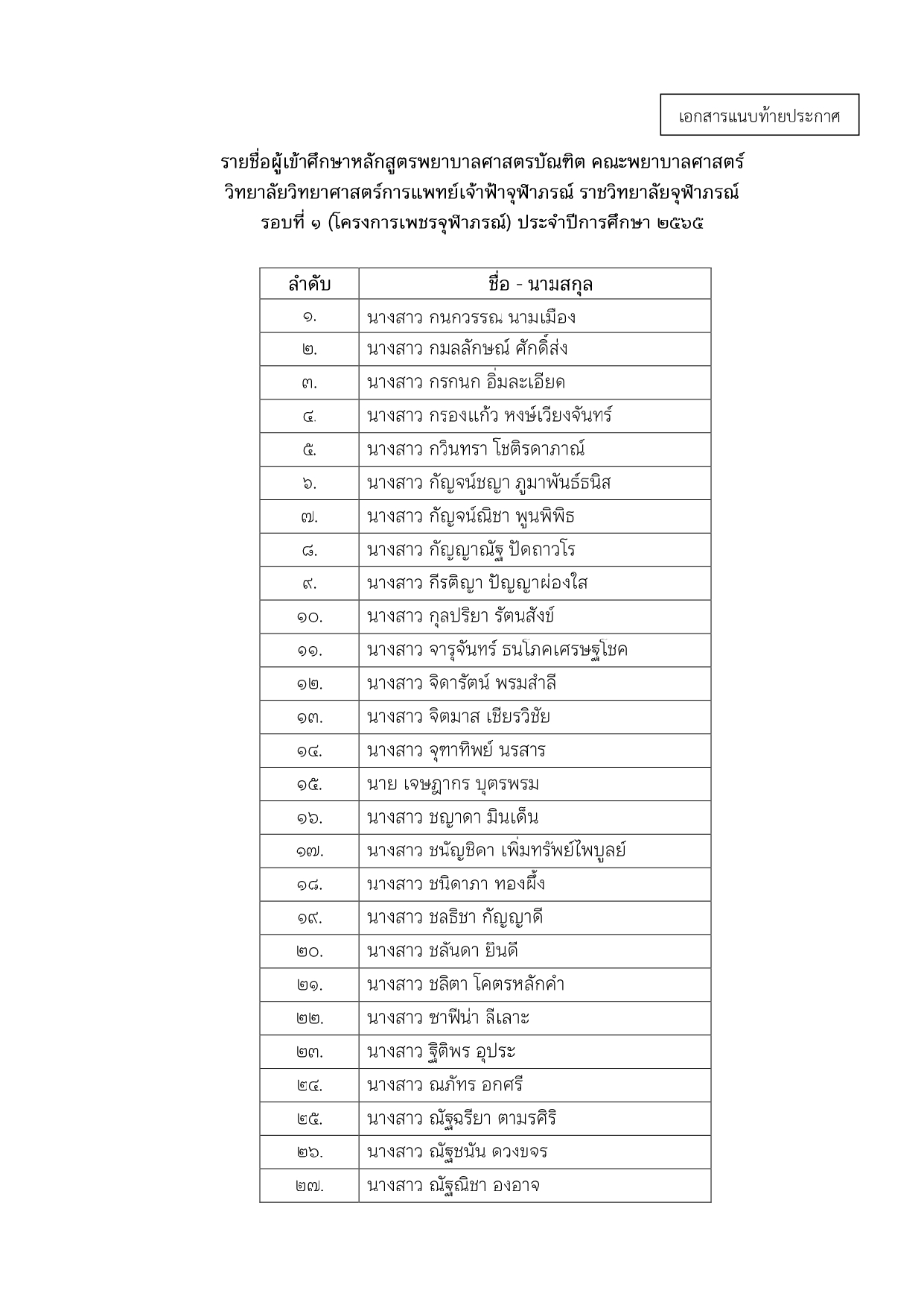 ประกาศ คณะพยาบาลศาสตร์ เรื่อง รายชื่อยืนยันสิทธิ์เข้าศึกษาหลักสูตรพยาบาลศาสตรบัณฑิต คณะพยาบาลศาสตร์ วิทยาลัยวิทยาศาสตร์การเเพทย์เจ้าฟ้าจุฬาภรณ์ ราชวิทยาลัยจุฬาภรณ์ รอบที่ ๑ (โครงการเพชรจุฬาภรณ์) ประจำปีการศึกษา ๒๕๖๕