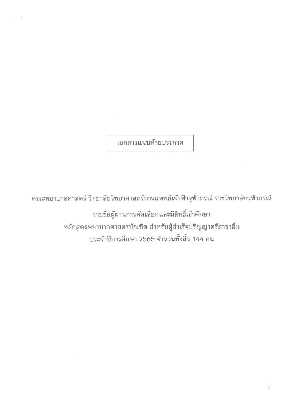 ประกาศ คณะพยาบาลศาสตร์ เรื่อง รายชื่อผู้ผ่านการคัดเลือกและมีสิทธิ์เข้าศึกษา หลักสูตรพยาบาลศาสตรบัณฑิต สำหรับผู้สำเร็จปริญญาตรีสาขาอื่น ประจำปีการศึกษา ๒๕๖๕