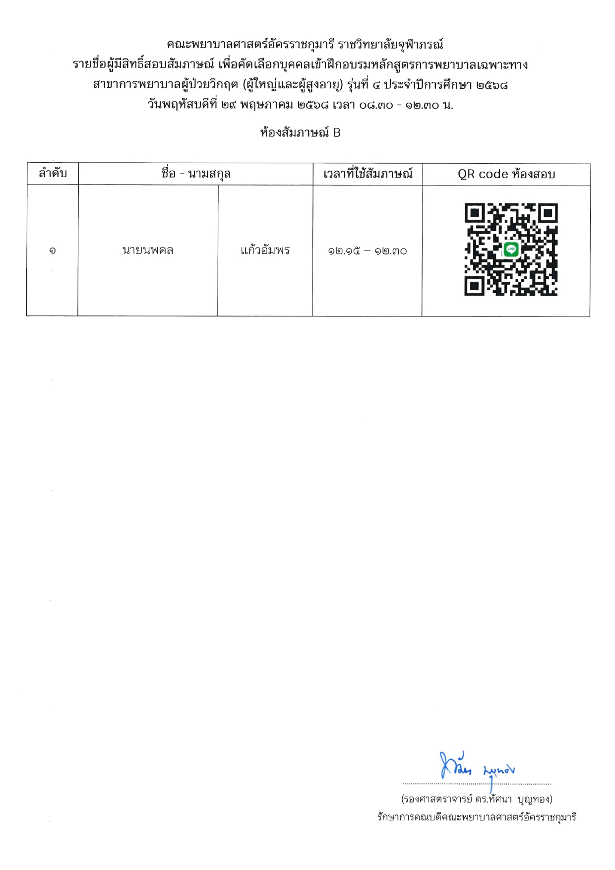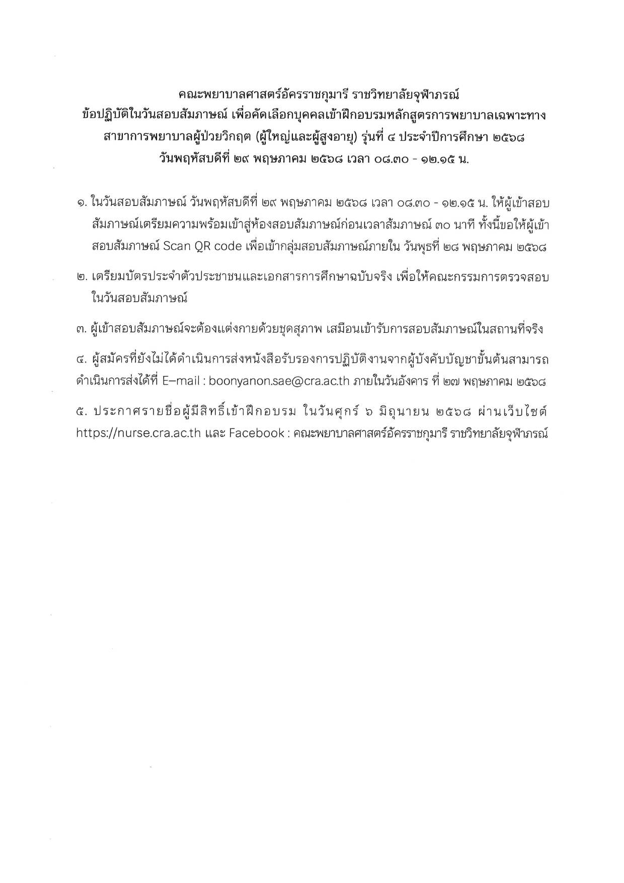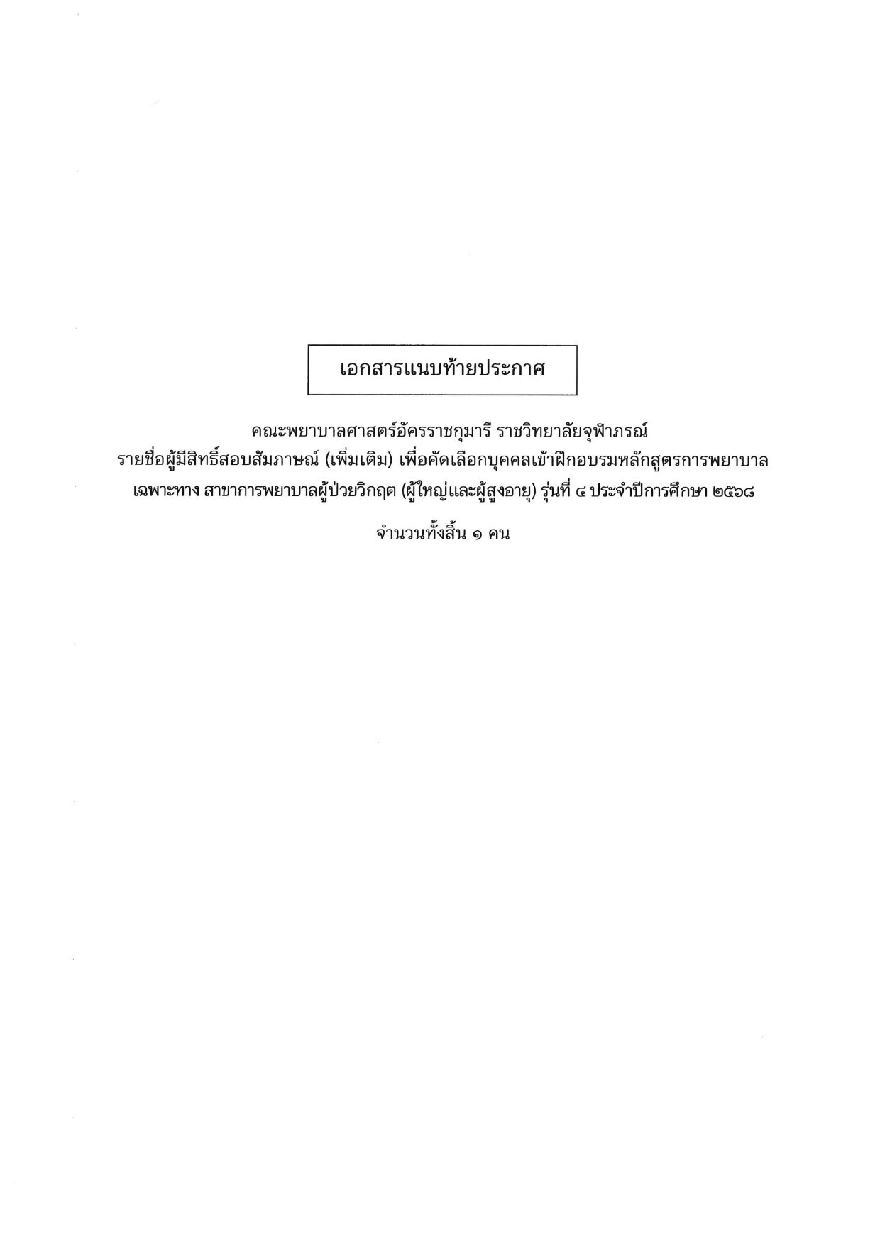 ประกาศ เรื่อง รายชื่อผู้มีสิทธิ์สอบสัมภาษณ์ (เพิ่มเติม) เพื่อคัดเลือกบุคคลเข้าฝึกอบรมหลักสูตรการพยาบาลเฉพาะทาง สาขาการพยาบาลผู้ป่วยวิกฤต (ผู้ใหญ่และผู้สูงอายุ) รุ่นที่ ๔ ประจำปีการศึกษา ๒๕๖๘