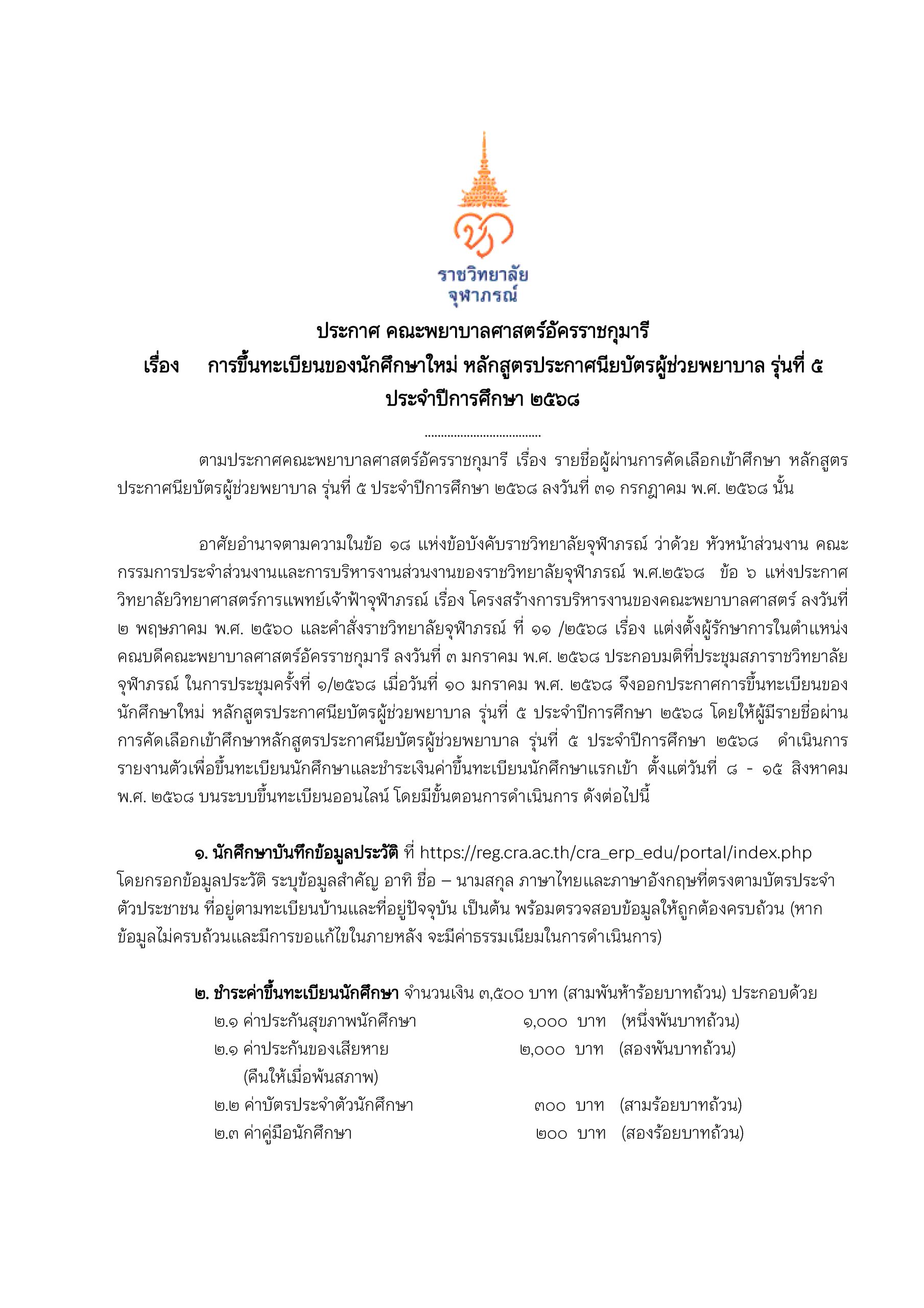ประกาศ เรื่อง การขึ้นทะเบียนของนักศึกษาใหม่ หลักสูตรประกาศนียบัตรผู้ช่วยพยาบาล รุ่นที่ ๕ ประจำปีการศึกษา ๒๕๖๘