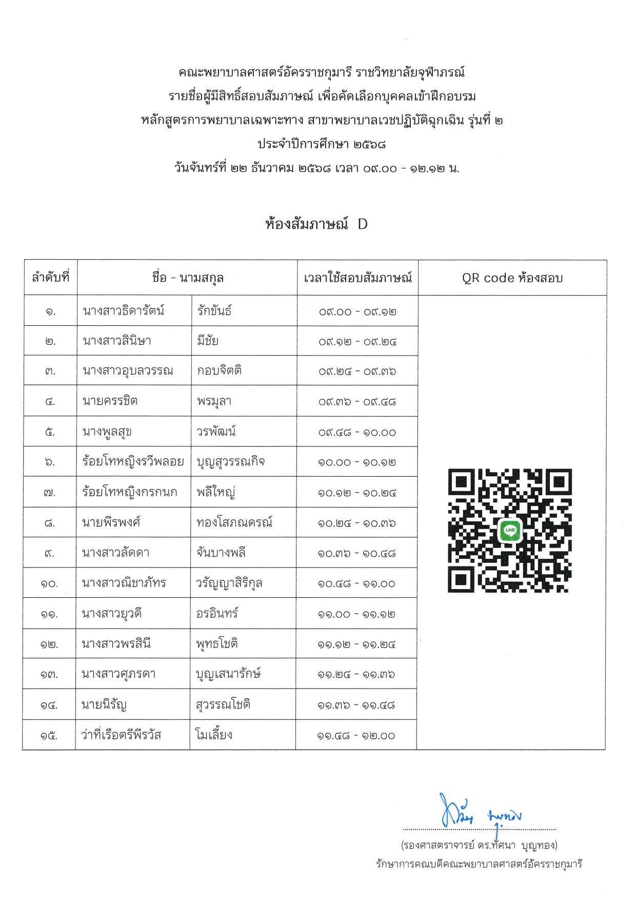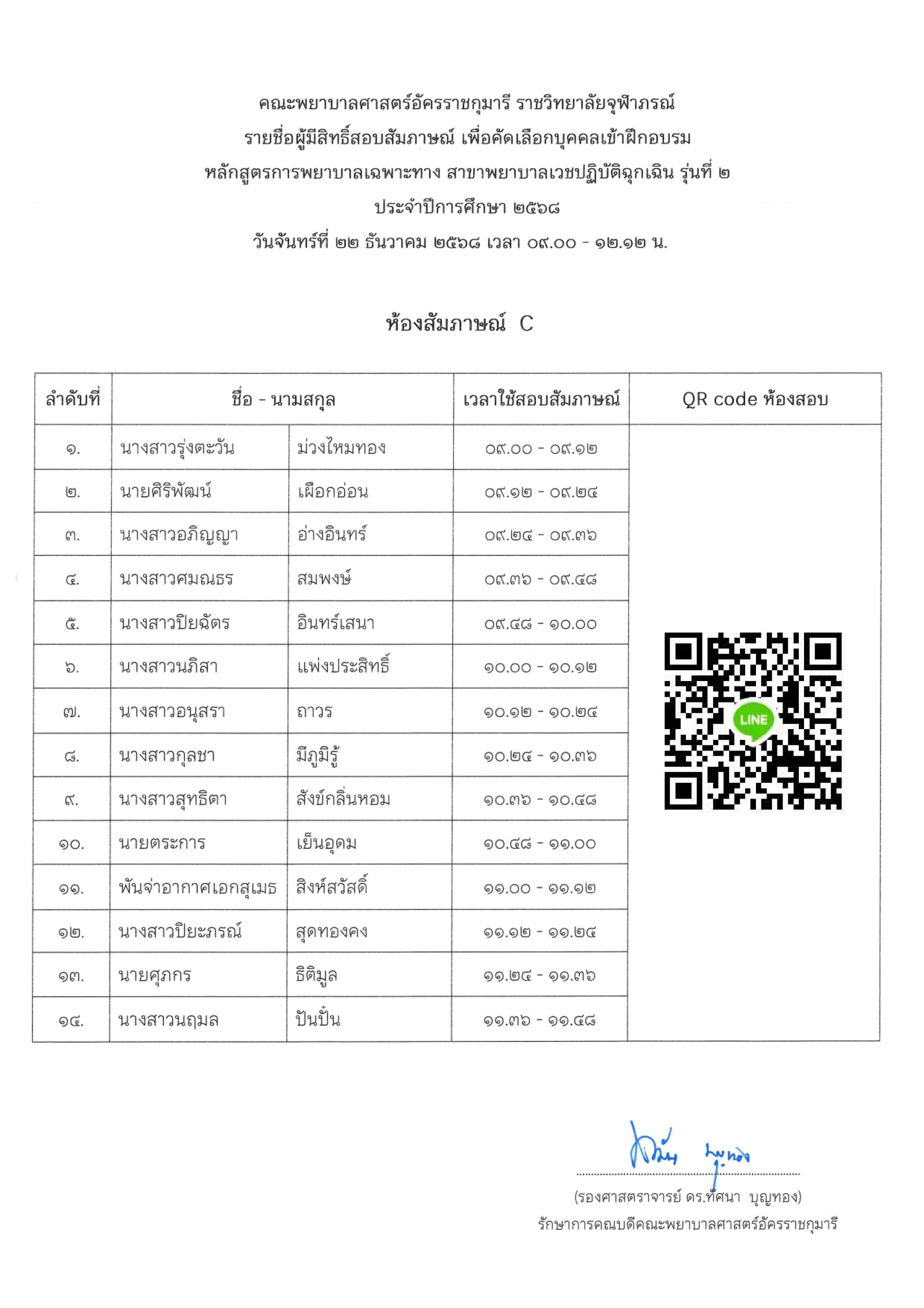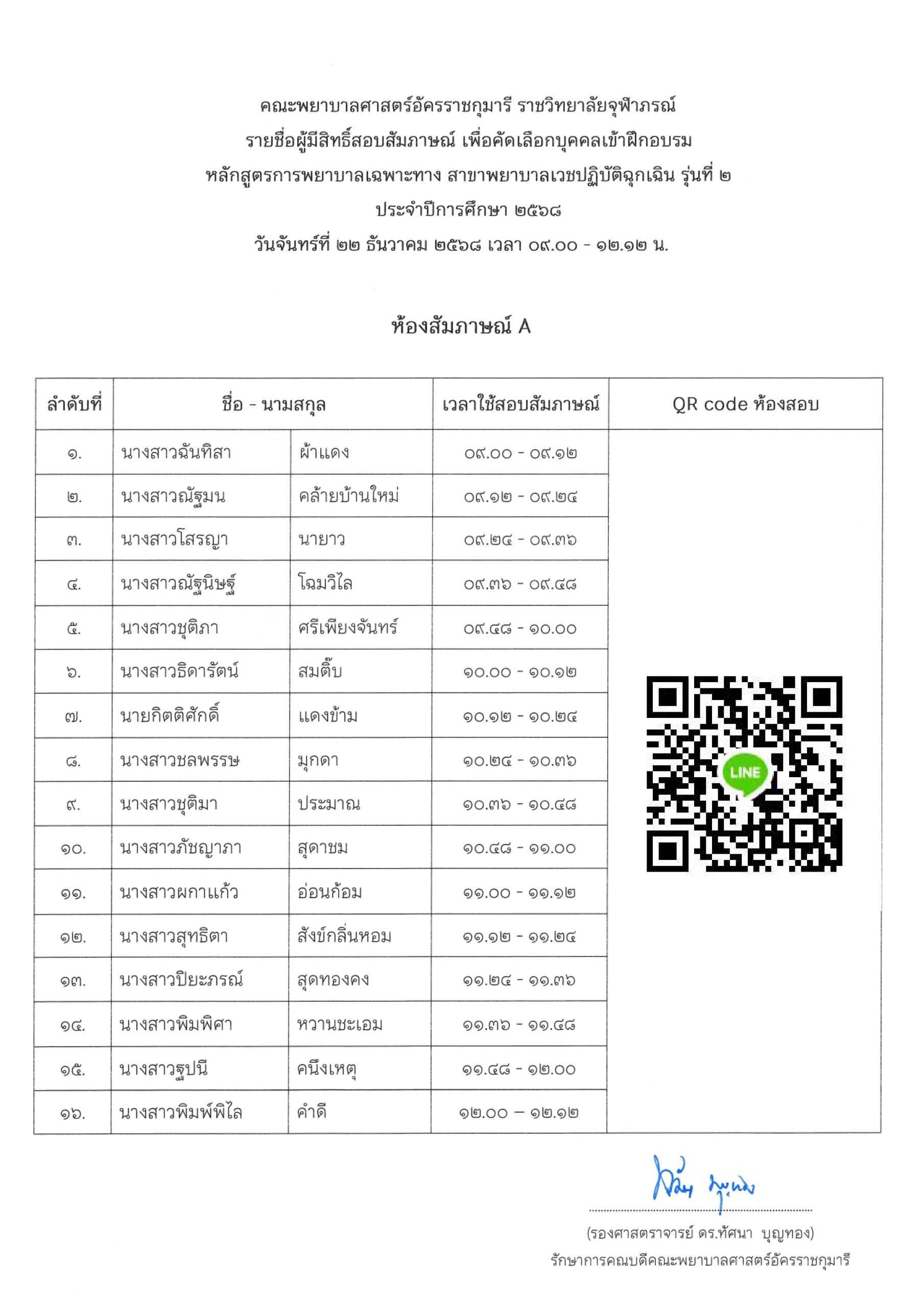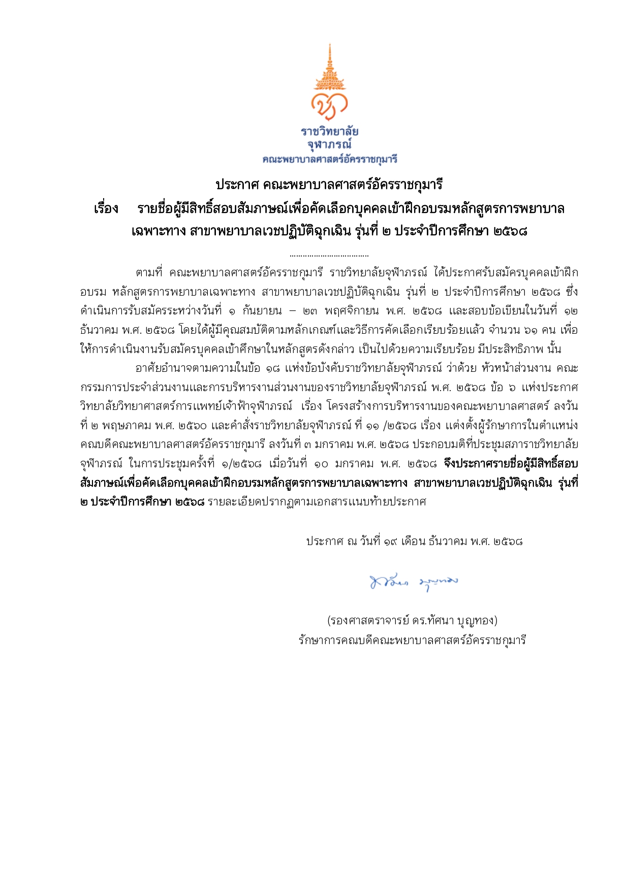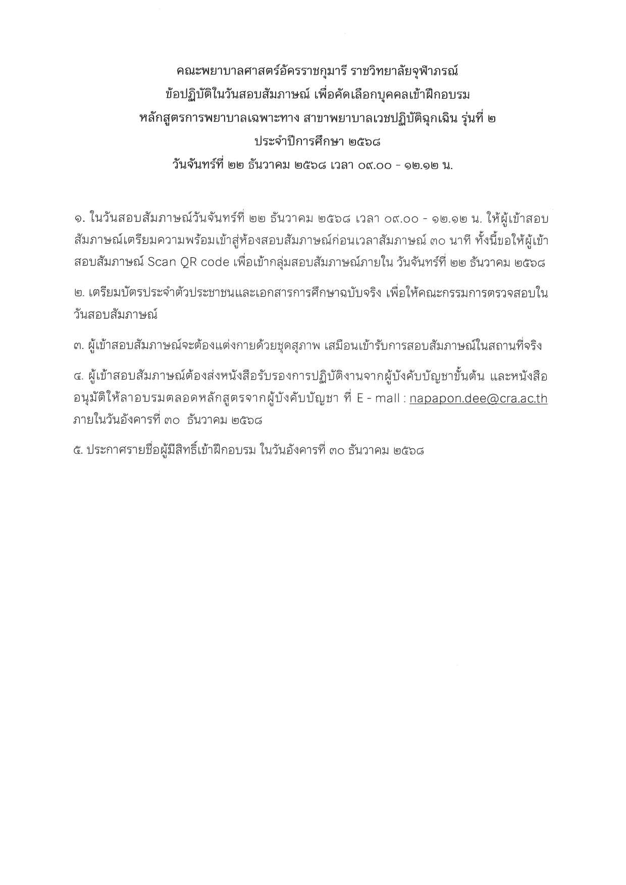 ประกาศ เรื่อง รายชื่อผู้มีสิทธิ์สอบสัมภาษณ์เพื่อคัดเลือกบุคคลเข้าฝึกอบรมหลักสูตรการพยาบาลเฉพาะทาง สาขาพยาบาลเวชปฏิบัติฉุกเฉิน รุ่นที่ ๒ ประจำปีการศึกษา ๒๕๖๘