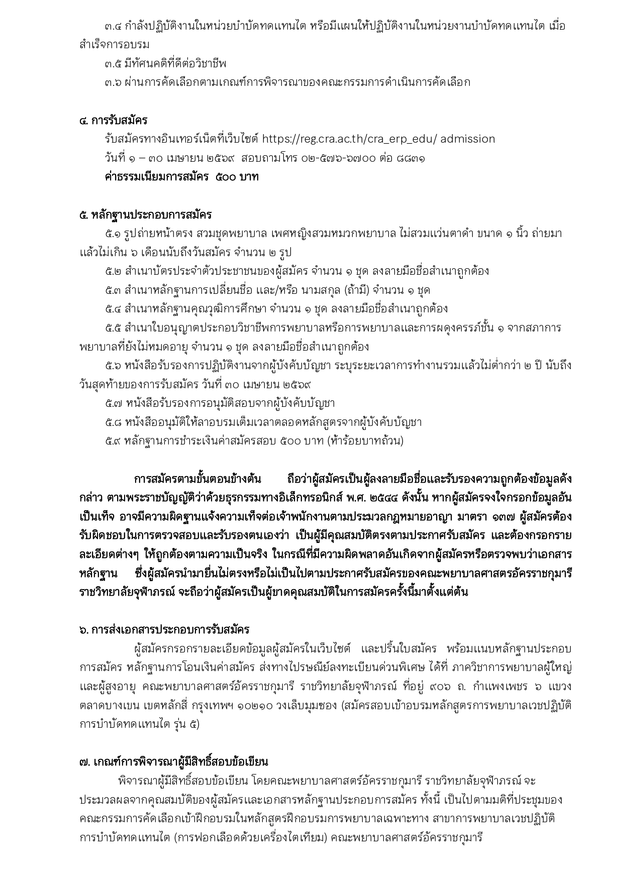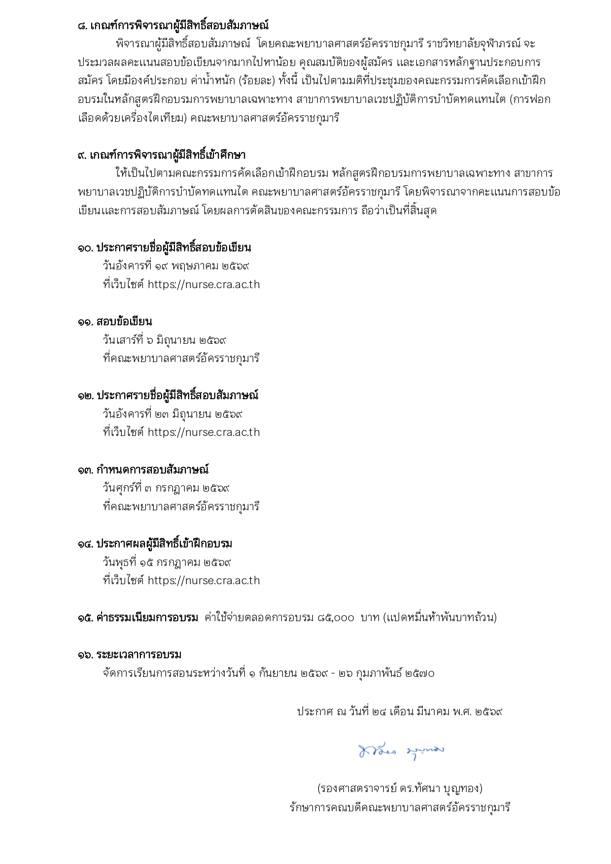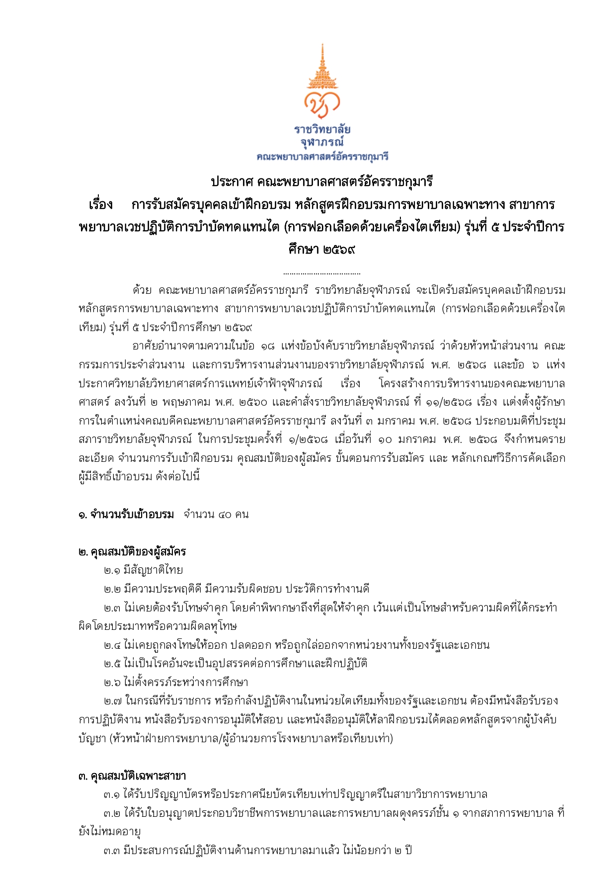 ประกาศ เรื่อง การรับสมัครบุคคลเข้าฝึกอบรมหลักสูตรฝึกอบรมการพยาบาลเฉพาะทาง สาขาการพยาบาลเวชปฏิบัติการบำบัดทดแทนไต (การฟอกเลือดด้วยเครื่องไตเทียม) รุ่นที่ ๕ ประจำปีการศึกษา ๒๕๖๙