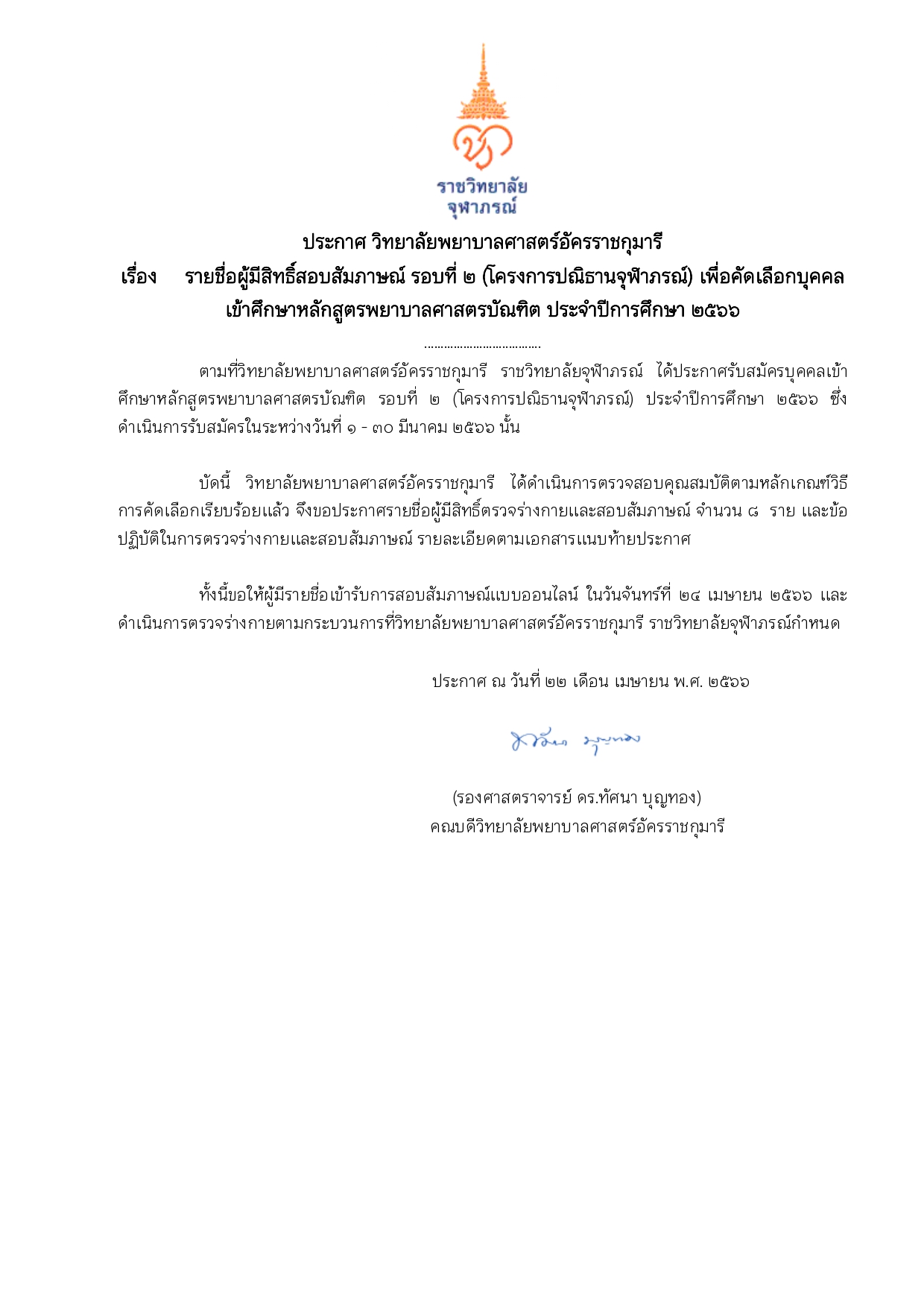 ประกาศ วิทยาลัยพยาบาลศาสตร์ อัครราชกุมารี เรื่อง รายชื่อผู้มีสิทธิ์สอบสัมภาษณ์ รอบที่ ๒ (โครงการปณิธานจุฬาภรณ์) เพื่อคัดเลือกบุคคลเข้าศึกษาหลักสูตรพยาบาลศาสตรบัณฑิต ประจำปีการศึกษา ๒๕๖๖