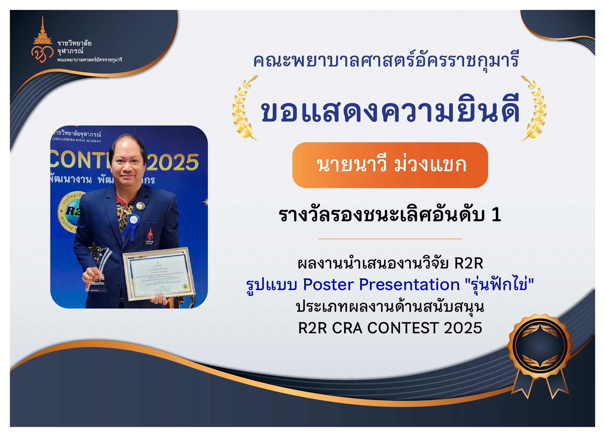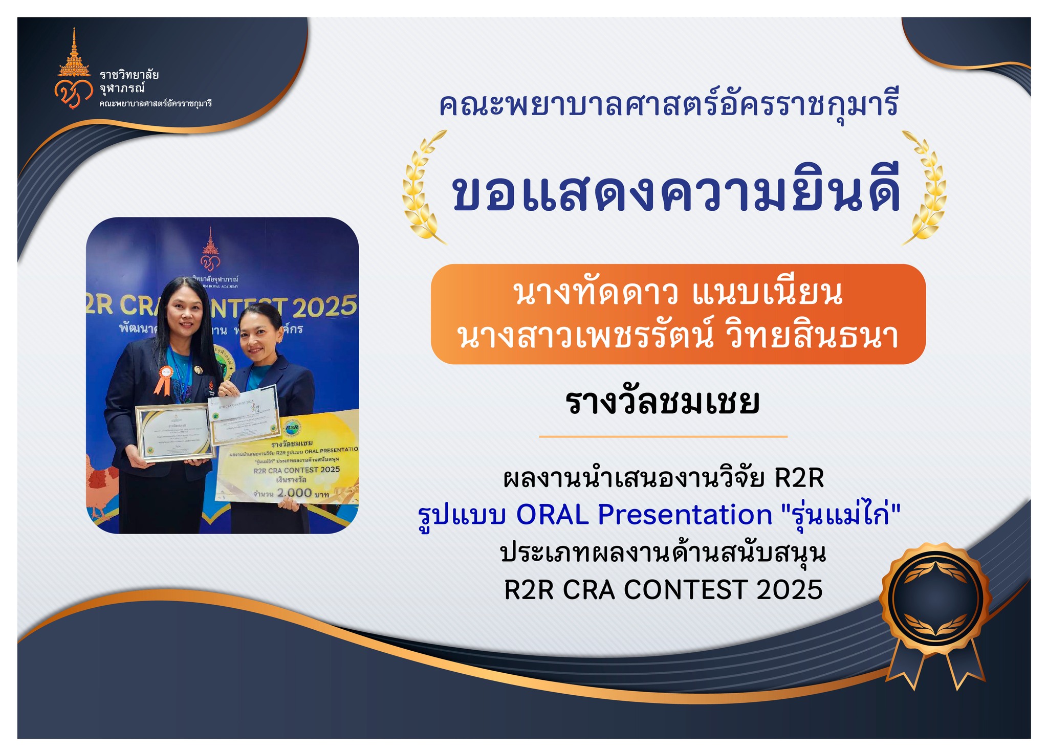 - ส่งผลงานเข้าร่วมการประกวด R2R CRA CONTEST 2025 ประเภทผลงานด้านสนับสนุน และได้รับรางวัล จำนวน 2 โครงการ คือ