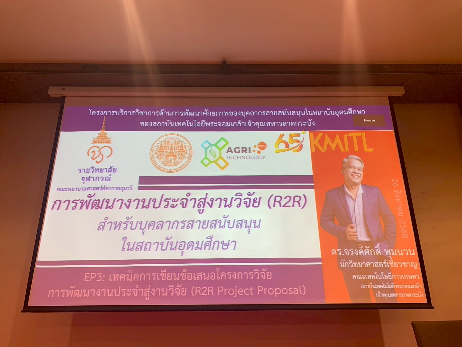 เมื่อวันที่ 10 กันยายน 2568 ที่ผ่านมา ณ โรงแรมเซ็นทารา ไลฟ์ ศูนย์ราชการและคอนเวนชันเซ็นเตอร์ แจ้งวัฒนะ ทางคณะกรรมการส่งเสริมการวิจัยและนวัตกรรม คณะพยาบาลศาสตร์อัครราชกุมารี ได้เข้าร่วมรับฟังการนำเสนอผลงานและให้ข้อคิดเห็นในการพัฒนาข้อเสนอโครงการการพัฒนาศักยภาพทักษะด้านการวิจัยจากงานประจำ (R2R) ประจำปี 2568 จากบุคลากรสายสนับสนุน คณะพยาบาลศาสตร์อัครราชกุมารี ที่ได้มีการจัดอบรมขึ้นทั้งหมด 4 ครั้ง ครั้งที่ 1 เมื่อวันที่ 11 มิถุนายน 2568 ครั้งที่ 2 วันที่ 22 กรกฎาคม 2568 ครั้งที่ 3 วันที่ 26 สิงหาคม 2568 และครั้งที่ 4 วันที่ 10 กันยายน 2568 มีผู้เข้าร่วมอบรม จำนวน 45 คน ทั้งนี้ได้รับเกียรติจาก ดร.จรงค์ศักดิ์ พุมนวน นักวิทยาศาสตร์เชี่ยวชาญ สังกัดสถาบันเทคโนโลยีพระจอมเกล้าเจ้าคุณทหารลาดกระบังเป็นวิทยากรในอบรม ซึ่งลักษณะการอบรมเป็นการบรรยายให้ความรู้ ฝึกปฏิบัติเขียนพัฒนาหัวข้อการวิจัยจากงานประจำ และนำเสนอหัวข้องานวิจัยจากงานประจำ โดยมีผู้แทนจากคณะกรรมการส่งเสริมการวิจัยและนวัตกรรม คณะพยาบาลศาสตร์อัครราชกุมารี เข้าร่วมรับฟังการนำเสนอผลงานและให้ข้อคิดเห็นในการพัฒนาข้อเสนอโครงการให้มีความสมบูรณ์ และได้รับผลงานจากการอบรมการพัฒนาศักยภาพทักษะด้านการวิจัยจากงานประจำครั้งนี้ ดังนี้