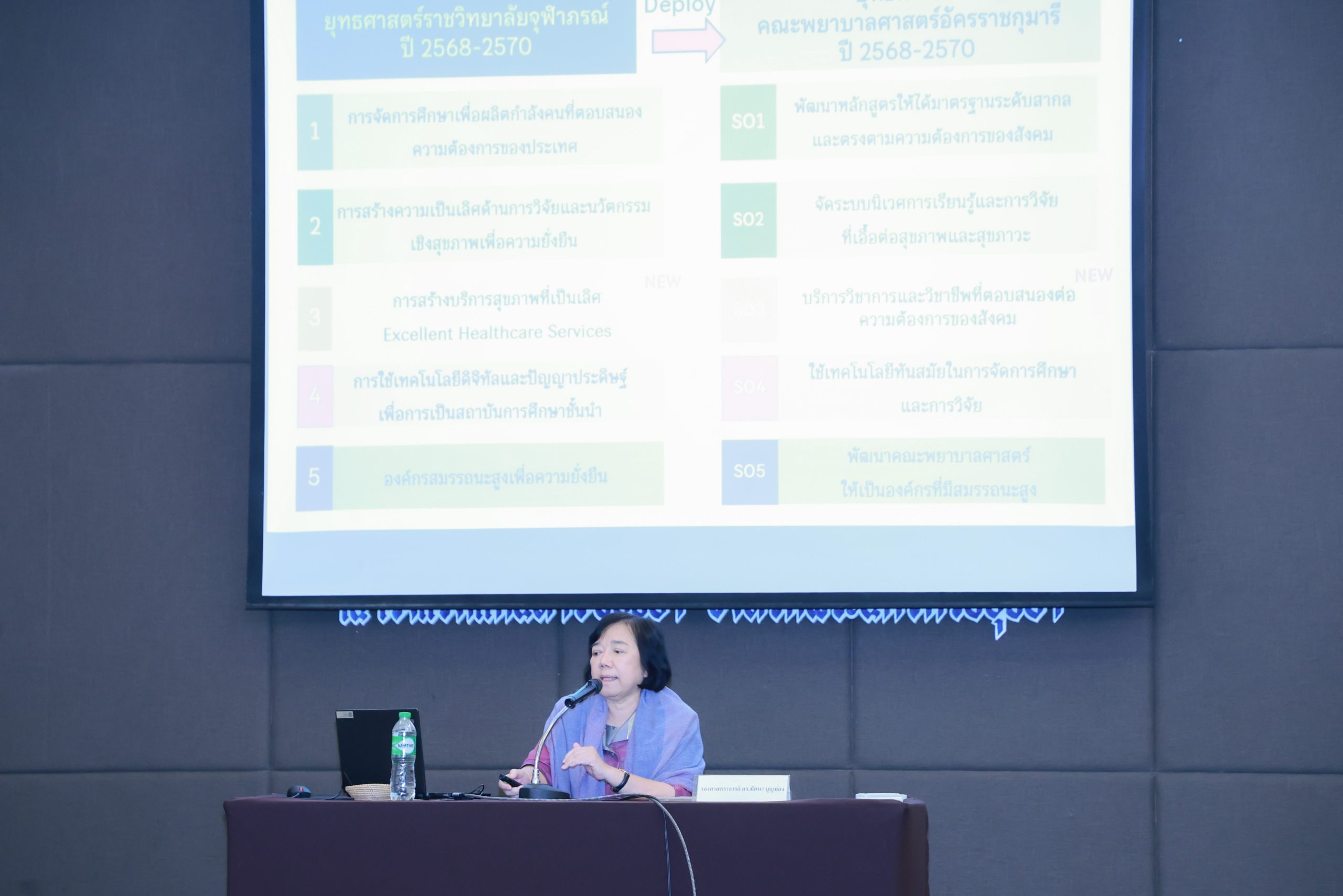 นำโดย รองศาสตราจารย์ ดร.ทัศนา บุญทอง คณบดีคณะพยาบาลคณะกุมารี ได้กล่าวเปิดโครงการ จากนั้น คณะผู้บริหาร อาจารย์และเจ้าหน้าที่ ได้ร่วมกันทบทวนแผนกลยุทธ์ประจำปี ซึ่งทำให้เห็นภาพรวมของการดำเนินงานที่ผ่านมา และวางแผนกิจกรรมเพื่อให้มุ่งสู่เป้าหมายและวิสัยทัศน์ที่กำหนดไว้ในแผนยุทธศาสตร์คณะพยาบาลศาสตร์อัครราชกุมารี พ.ศ. 2565-2570 อย่างมีประสิทธิภาพ