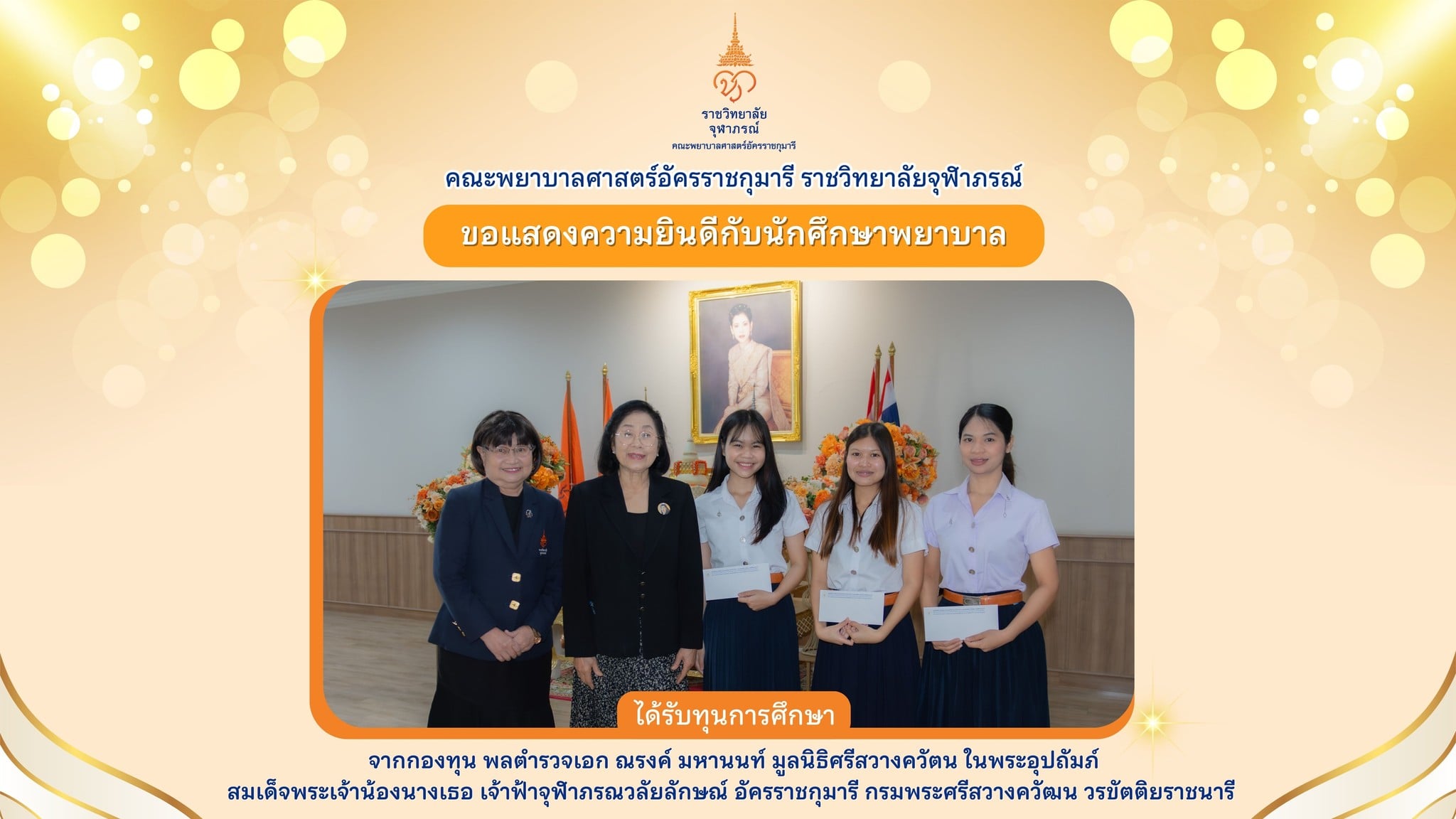 ในนามของคณบดี และคณาจารย์ทุกคนของคณะพยาบาลศาสตร์อัครราชกุมารี ราชวิทยาลัยจุฬาภรณ์ ขอต้อนรับนักศึกษาทุกคนเข้าสู่คณะพยาบาลศาสตร์ด้วยความยินดียิ่ง และขอแสดงความชื่นชมในความสำเร็จของนักศึกษาทุกคนที่ได้สอบผ่านการคัดเลือกเข้ามาเป็นส่วนหนึ่งของสถาบันการศึกษาแห่งนี้ ซึ่งนับได้ว่าเป็นก้าวสำคัญก้าวหนึ่งในชีวิตของนักศึกษาทุกคนเพราะต่อแต่นี้ไปจนครบ 4 ปี นักศึกษาจะได้ศึกษาเรียนรู้เพื่อเตรียมเป็นผู้ประกอบวิชาชีพที่เรียกว่า “การพยาบาลและการผดุงครรภ์” ที่ทุกคนได้เลือกแล้ว