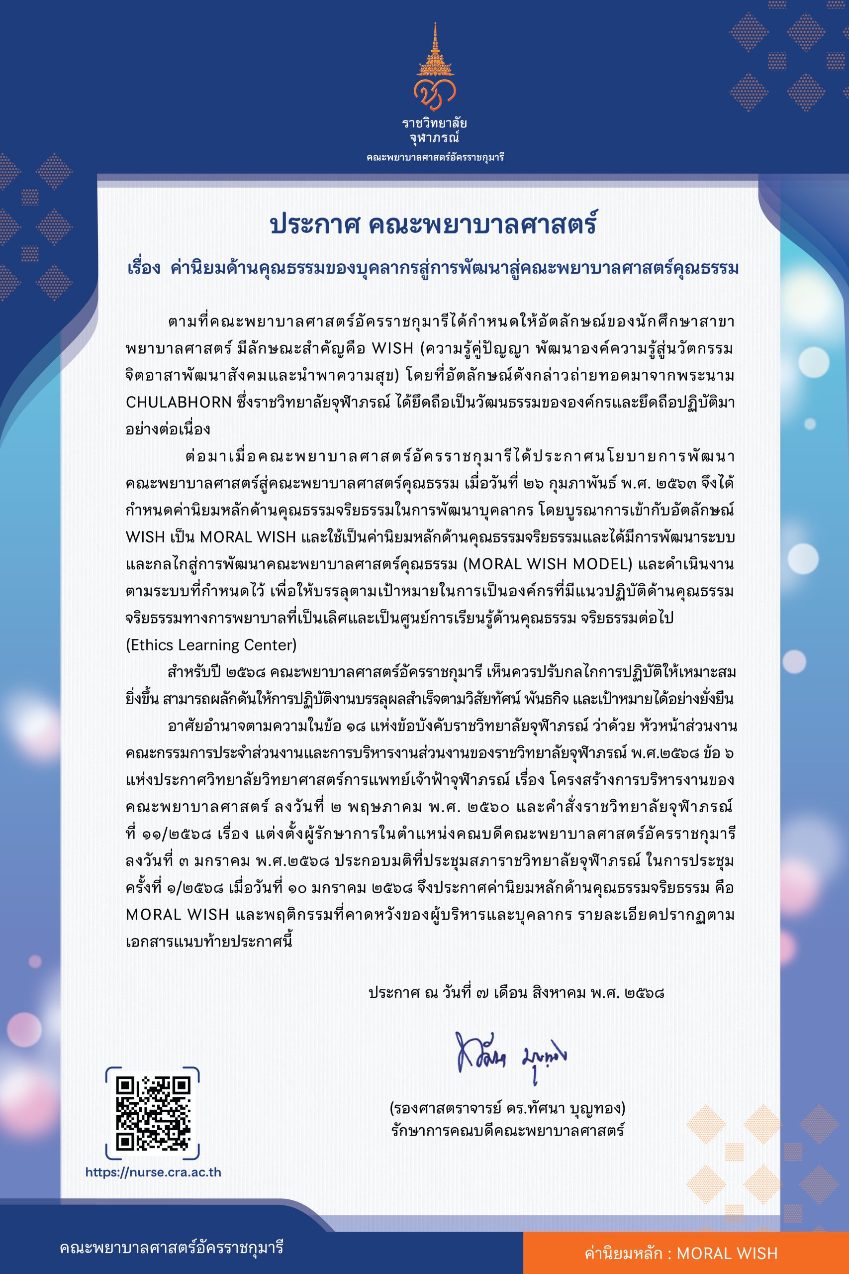 ประกาศ คณะพยาบาลศาสตร์ เรื่อง ค่านิยมด้านคุณธรรมของบุคลากรสู่การพัฒนาสู่คณะพยาบาลศาสตร์คุณธรรม