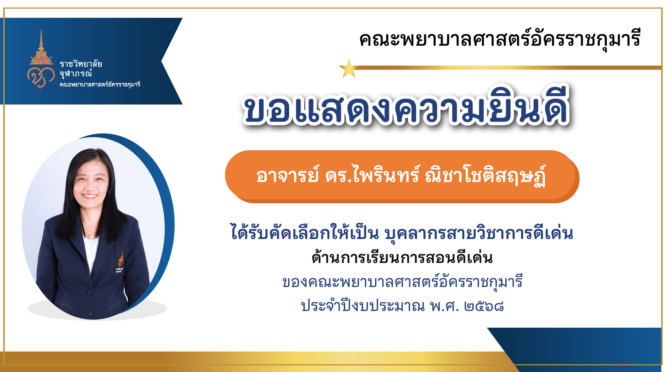คณะพยาบาลศาสตร์อัครราชกุมารี ขอแสดงความยินดีกับทุกท่านที่ได้รับรางวัลบุคลากรดีเด่น ประจำปีงบประมาณ 2568