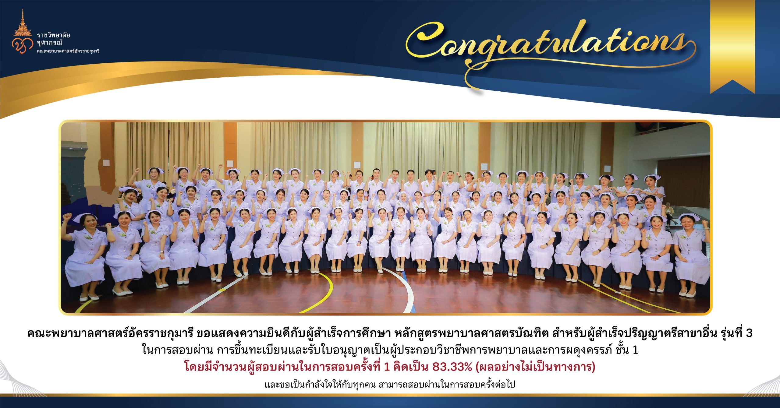 ขอเเสดงความยินดีกับผู้สำเร็จการศึกษา หลักสูตรพยาบาลศาสตรบัณฑิต สำหรับผู้สำเร็จปริญญาตรีสาขาอื่น รุ่นที่ 3 ในการสอบผ่าน การขึ้นทะเบียนและรับใบอนุญาตเป็นผู้ประกอบวิชาชีพการพยาบาลและการผดุงครรภ์ ชั้น 1