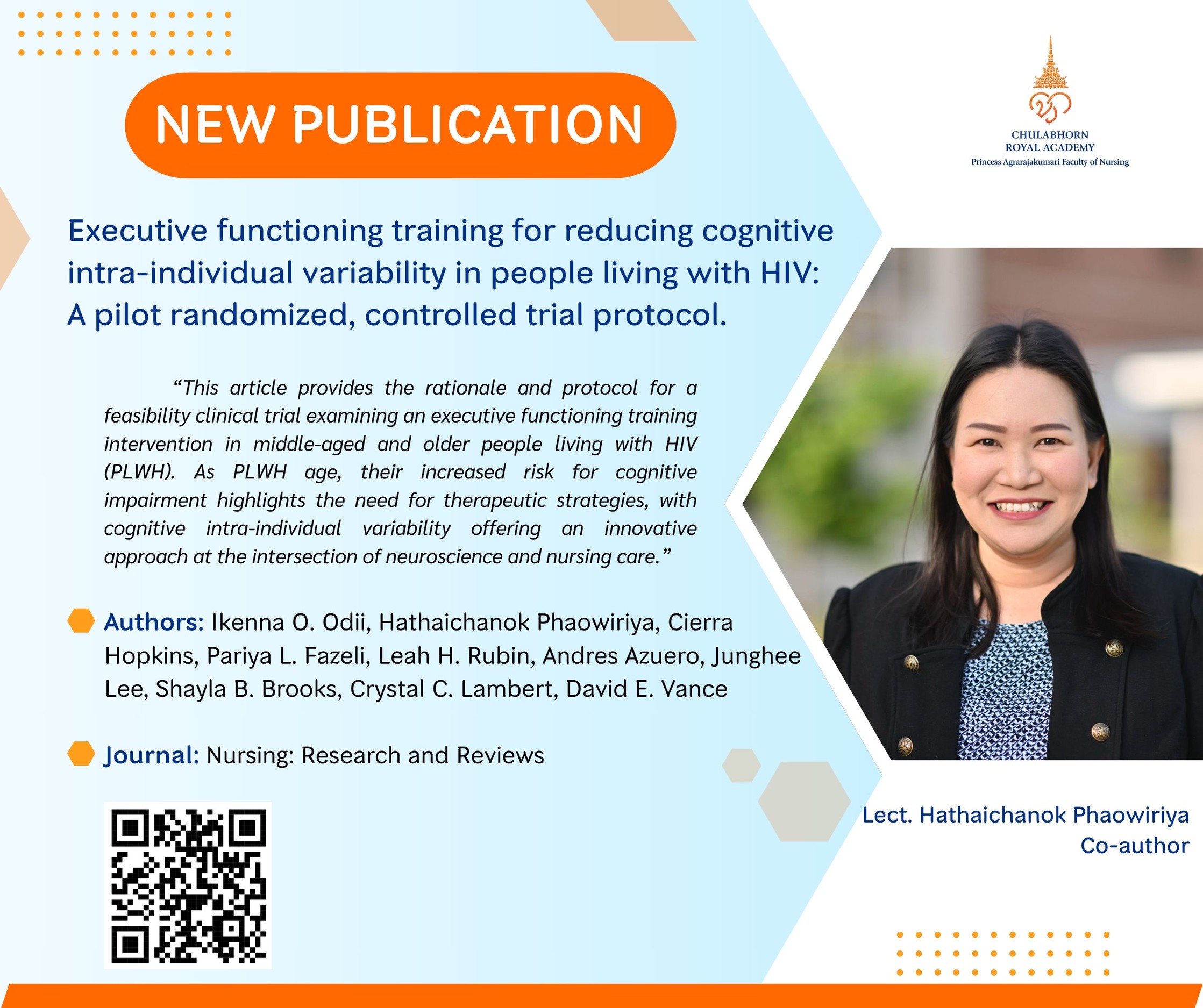 ขอเชิญชวนอ่าน ผลงานวิจัยฉบับใหม่ ชื่อบทความ: Executive functioning training for reducing cognitive intra-individual variability in people living with HIV: A pilot randomized, controlled trial protocol