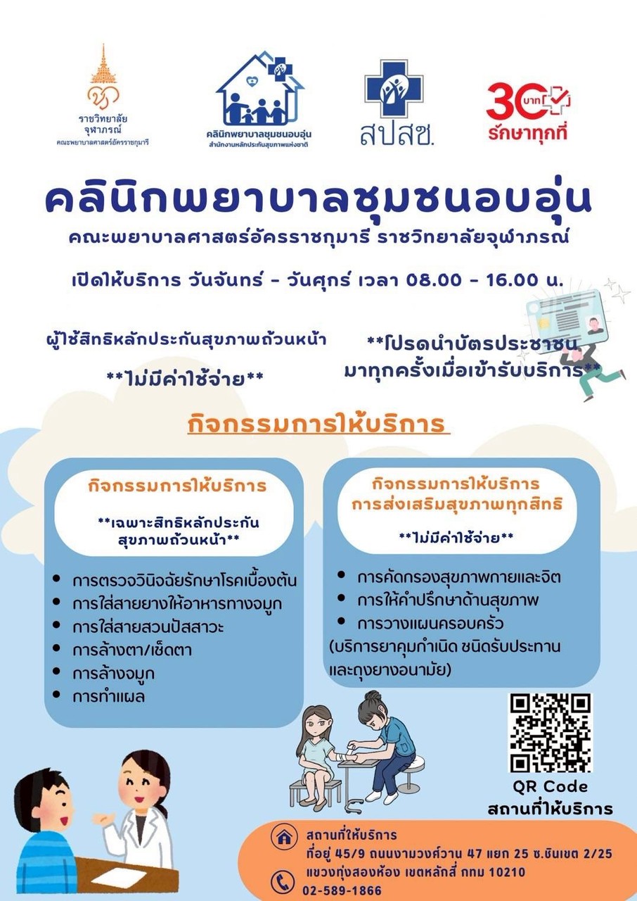 คลินิกการพยาบาลและการผดุงครรภ์ คณะพยาบาลศาสตร์อัครราชกุมารี ราชวิทยาลัยจุฬาภรณ์ ได้รับการขึ้นทะเบียนเป็นหน่วยบริการร่วมให้บริการในระบบหลักประกันสุขภาพแห่งชาติ แล้วเมื่อวันที่ 21 มิถุนายน 2564 คณะพยาบาลศาสตร์อัครราชกุมารี จึงเห็นควรเปิดคลินิกการพยาบาลและการผดุงครรภ์ คณะพยาบาลศาสตร์อัครราชกุมารี ราชวิทยาลัยจุฬาภรณ์ และศูนย์การเรียนรู้และบริการสุขภาพในชุมชน เขตหลักสี่ เพื่อให้บริการแก่ประชาชนตามวัตถุประสงค์ที่วางไว้ต่อไป