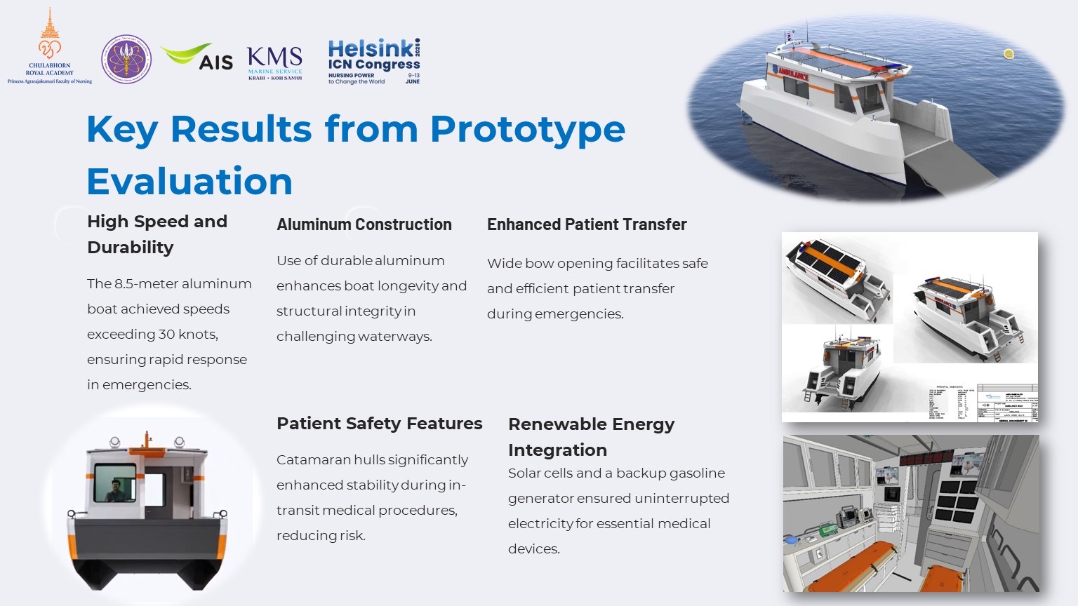 Her research introduced a prototype ambulance boat specifically designed to address the unique geographical challenges of remote dam reservoir areas in Thailand. The project adopted a multi-approach methodology, integrating: